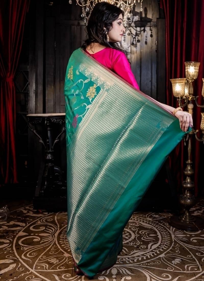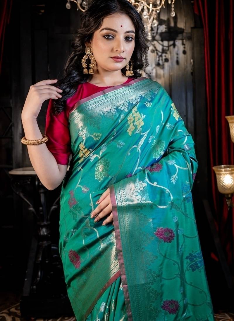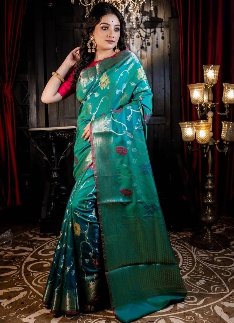 | Product Description | Vibrant & Enchanting, This Saree Beautifully Marries Rich Hues With Intricate Artistry. Featuring All Over Multi Colour Resham Floral Motifs & Delicate Jaal Work In Golden Zari, The Dual Tone Blend Of Green & Peacock Blue Creates A Striking Harmony That Celebrates Traditional Craftsmanship With A Contemporary Flair.