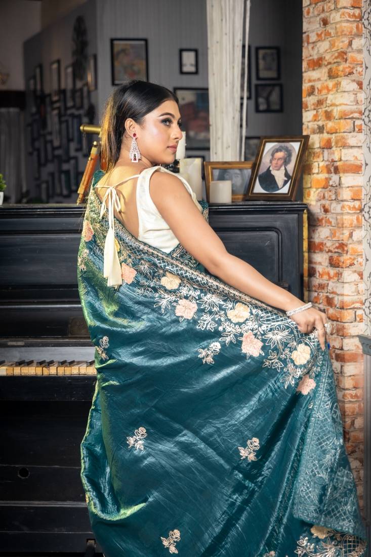 | Product Description | This Dark Metallic Ocean Green &Black Dual Tone Crushed Soft Tissue Base, Features All Over Pitta Zari Handwork Floral Buta & Multi Colour Applique &Pitta Zari Floral Jaal Border. The Delicate Pitta Zari Motifs Shimmer Gracefully Across The Crushed Soft Tissue Fabric, While The Multi Colour Applique Work Adds Vibrant Contrast & Depth. This Dual Tone Combination Creates A Striking Balance Of Sophistication & Modern Elegance, Perfect For Special Occasions Where You Want To Stand Out. |