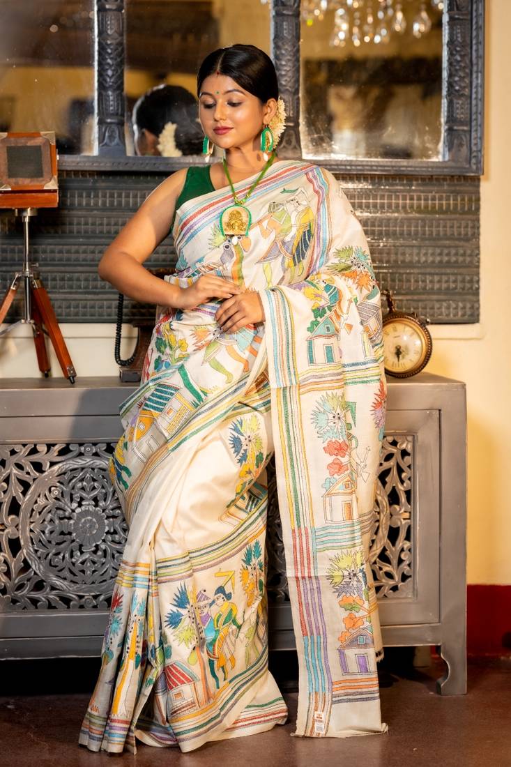 | Product Description | The Off White Pure Tussar Silk Handloom Kantha Stitch Embroidery Saree Is Adorned With Multi Colour ‘Village & Farmer’ Themed Motifs, Brought To Life Through Detailed Kantha Stitch Work That Reflects The Rhythms Of Pastoral Life.