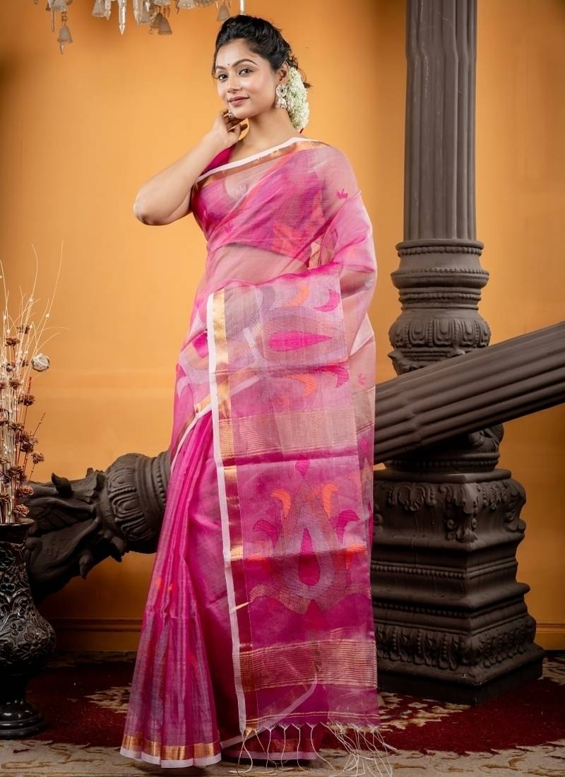 | Product Description | The Magenta Pink &Silver Dual Tone Premium Muslin Bengal Handloom Saree Is Adorned With All Over Multi Colour, Copper &Silver Zari Buti, Complemented By An Antique Gold Zari Plain Border & Intricate Traditional Motif Jamdani Border Highlights Along With A Matching Pallu That Enhance Its Regal Charm.
