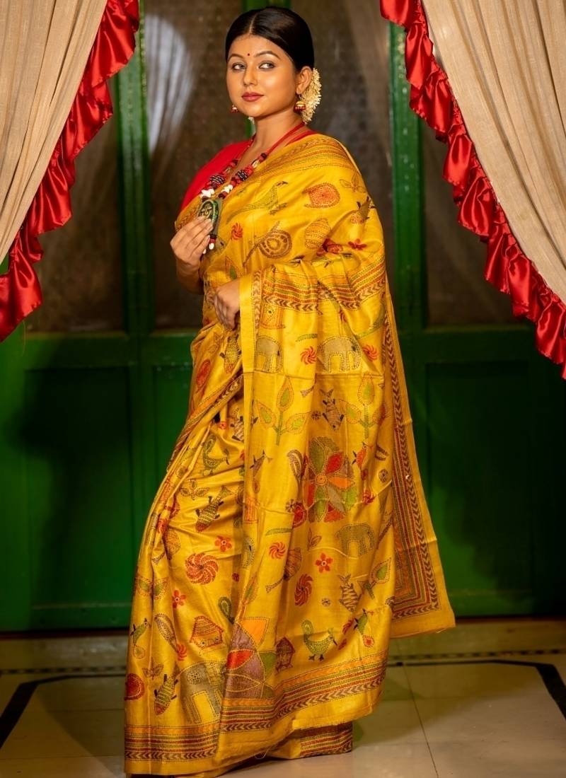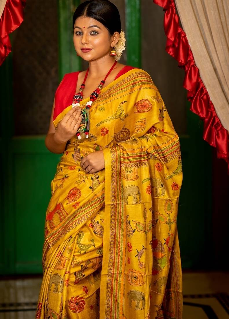 Yellow hand woven tussar kantha work all seasons sarees