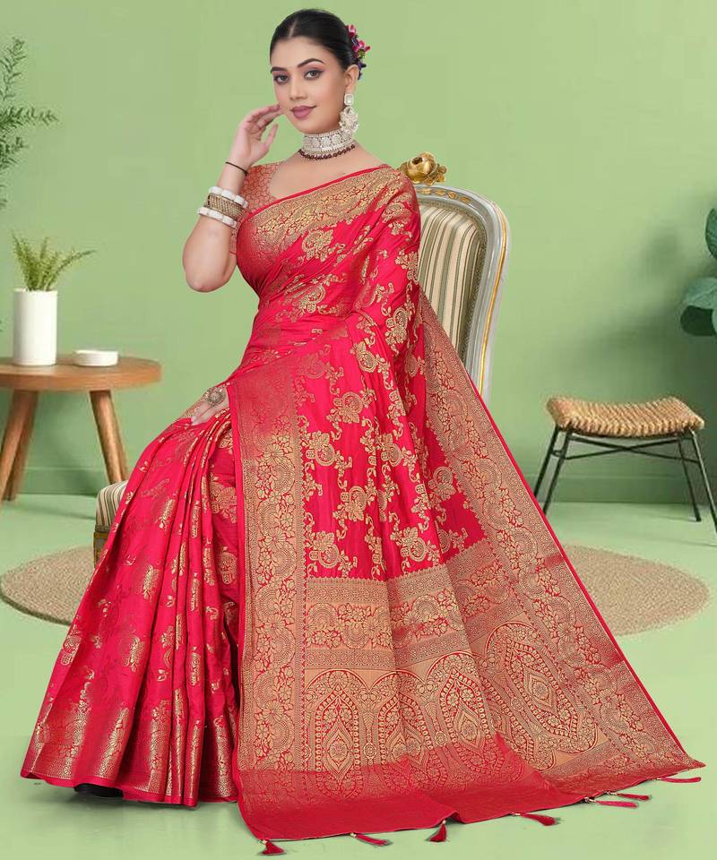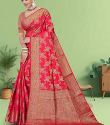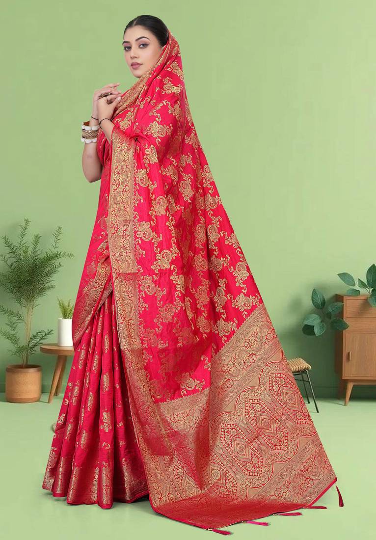 Maharanga red dola art silk saree with heavy zari floral weaving & broad traditional border | unstitched blouse piece
