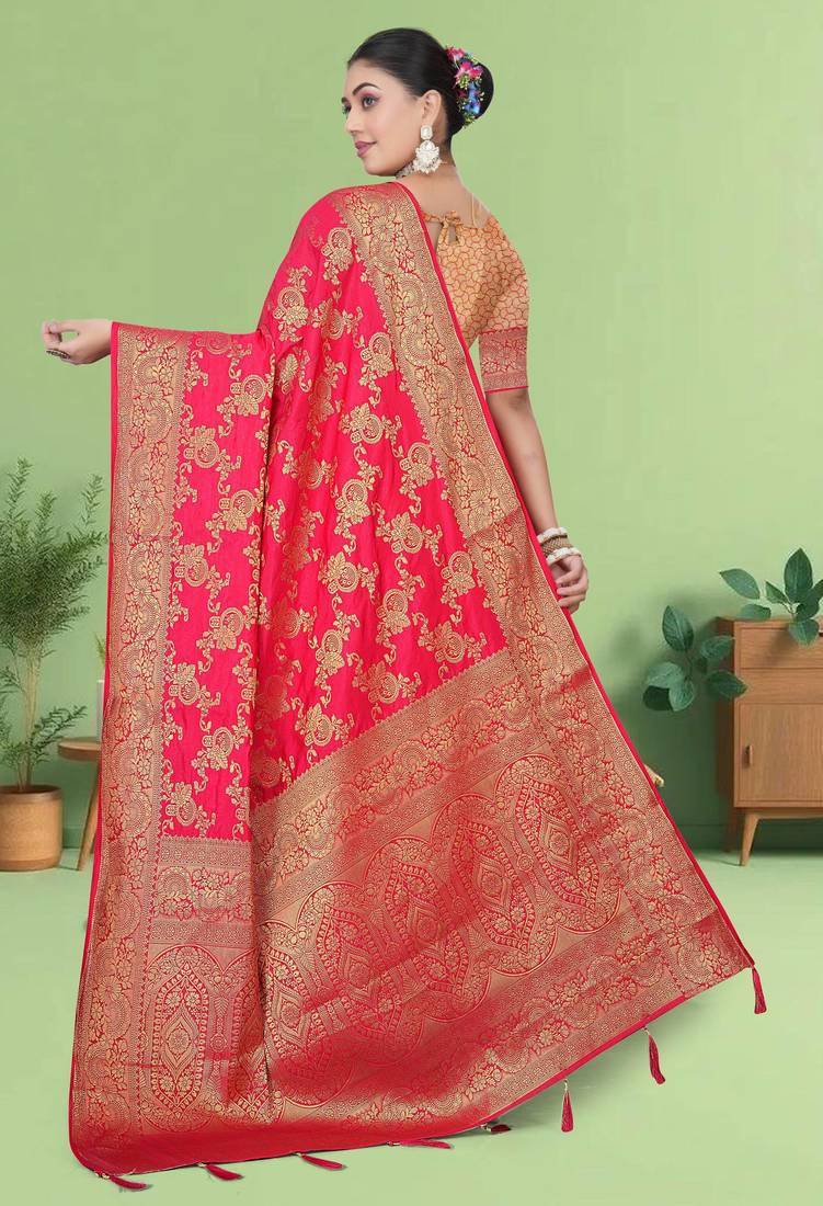 | Product Name | Maharanga Red Dola Art Silk Saree With Heavy Zari Floral Weaving & Broad Traditional Border | Unstitched Blouse Piece | |