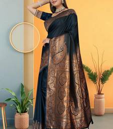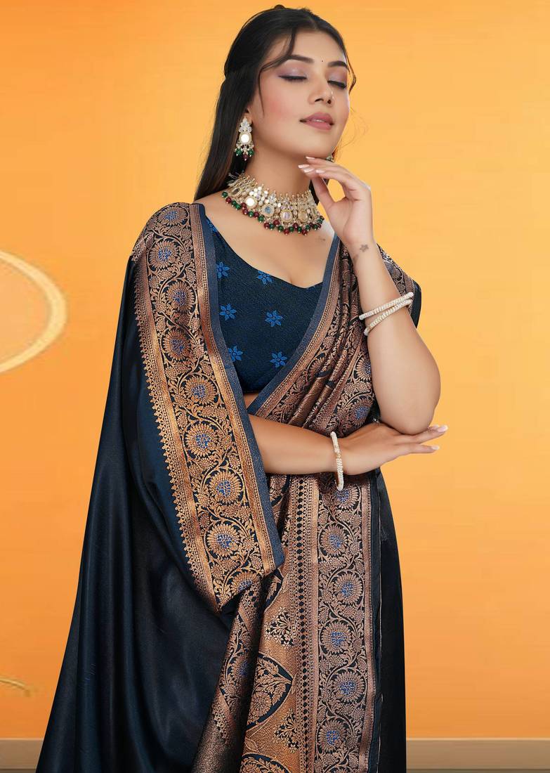 Navy blue satin saree with zari woven border & pallu