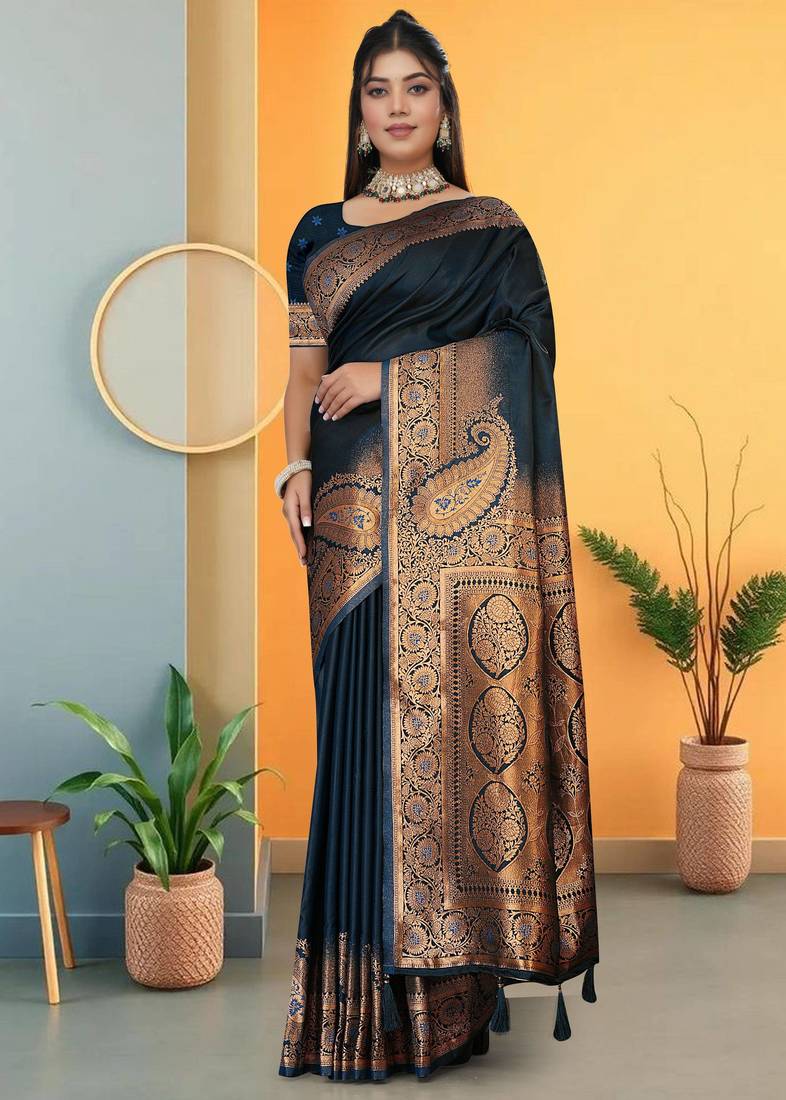 | Product Description | Make Every Festive Moment Unforgettable With This Navy Blue Satin Saree With Gold Zari Woven Border & Pallu A Luxurious Ethnic Choice That Radiates Timeless Elegance And Rich Craftsmanship! Crafted From Premium Satin Fabric In A Deep Navy Blue Hue, This Saree Features A Striking Gold Zari Woven Pallu And Traditional Border That Deliver Regal Appeal And Refined Style. Perfect For Weddings, Festivals, Receptions, And Special Cultural Celebrations, It Offers A Graceful Drape And Photo Ready Finish That Pairs Beautifully With Statement Jewellery. |