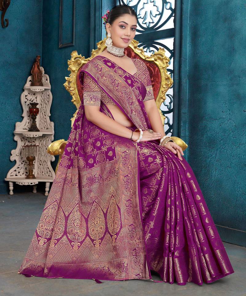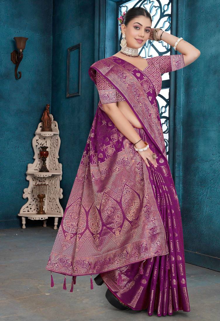 | Product Description | This Elegant Purple Saree Is Made From Premium Quality Dola Silk Fabric, Offering A Luxurious Feel And Graceful Fall. The Saree Features Heavy Zari Woven Geometric And Floral Motifs Across The Body, Giving It A Rich Banarasi Style Look. It Is Complemented With A Broad Traditional Zari Border And An Intricately Woven Pallu That Enhances Its Royal Appeal. Perfect Choice For Weddings, Festive Functions, Receptions, And Special Occasions. Comes With An Unstitched Matching Blouse Piece So You Can Stitch It According To Your Style And Fitting. |