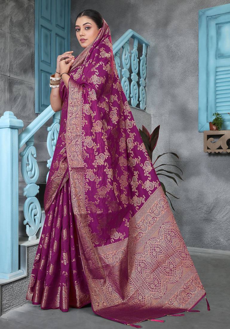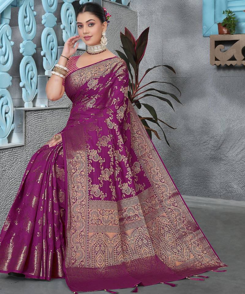 This Beautiful Purple Saree Is Crafted From Premium Dola Silk Fabric That Offers A Soft Touch And Elegant Drape. The Saree Is Adorned With Rich Zari Woven Work Across The Body, Giving It A Royal And Traditional Appearance. It Features A Classic Heavy Zari Border And A Richly Designed Pallu, Making It Perfect For Wedding Functions, Festive Celebrations, Parties, And Traditional Events. The Saree Comes With An Unstitched Matching Blouse Piece Which Can Be Stitched As Per Your Preferred Design And Fit.