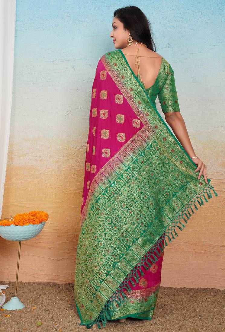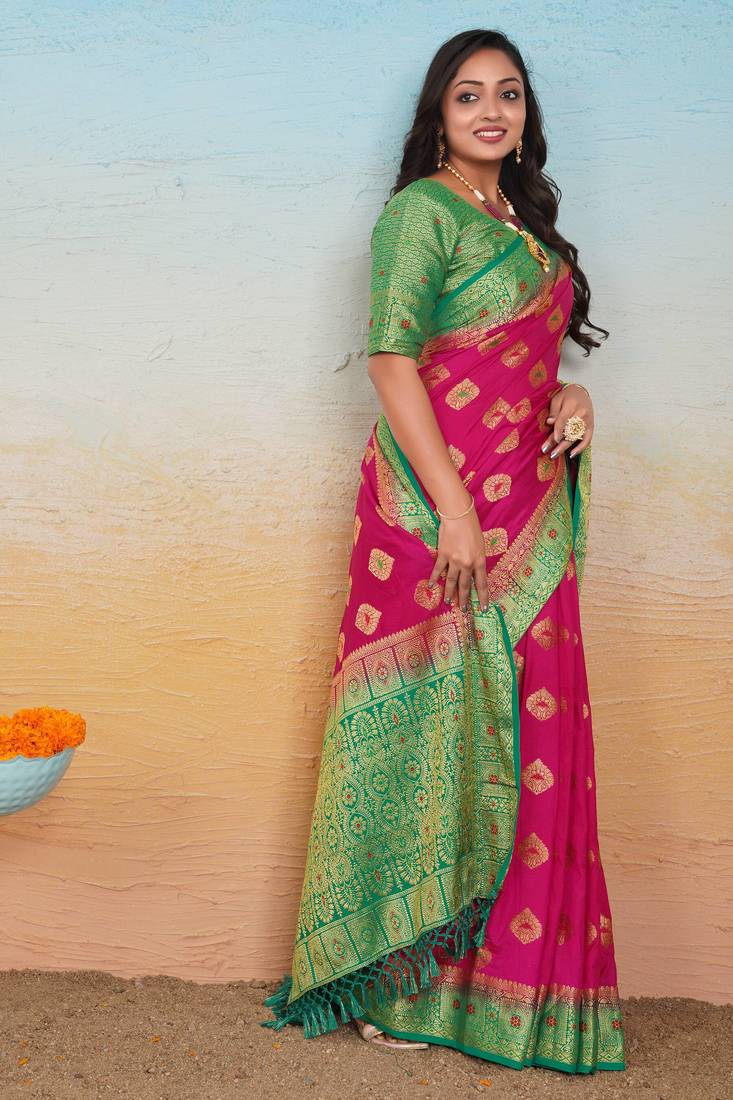 | Product Description | This Beautiful Rani Pink Dola Silk Saree Is Crafted With Intricate Woven Zari And Thread Butta Motifs Spread Across The Body, Giving It A Graceful Traditional Look. The Saree Is Highlighted With A Broad Green Contrast Border And A Richly Designed Banarasi Style Pallu Finished With Decorative Tassels. Comes With An Unstitched Matching Blouse Piece, Making It Ideal For Weddings, Festivals, Parties, And Traditional Functions. |