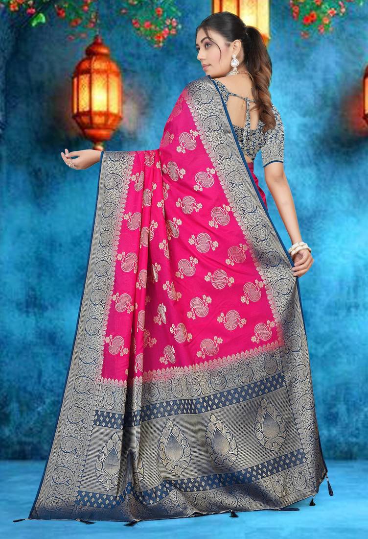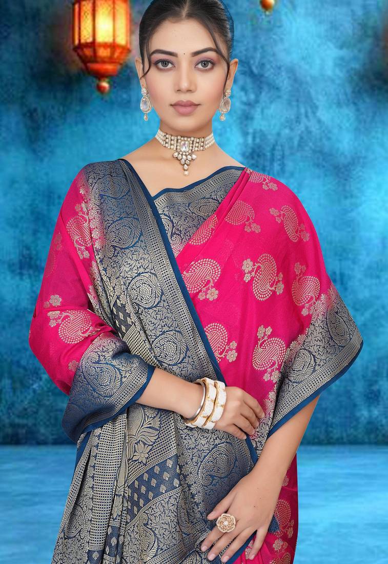 | Product Name | Rani Pink Soft Crepe Saree With Rich Zari Weaving & Navy Blue Contrast Border | Unstitched Blouse Piece By Maharanga | |