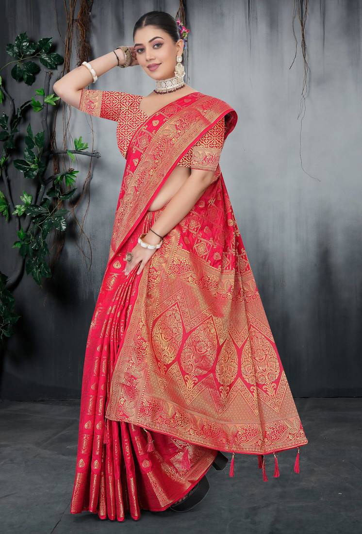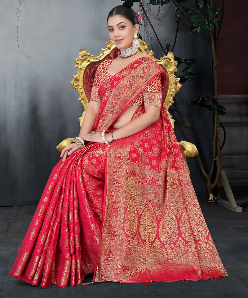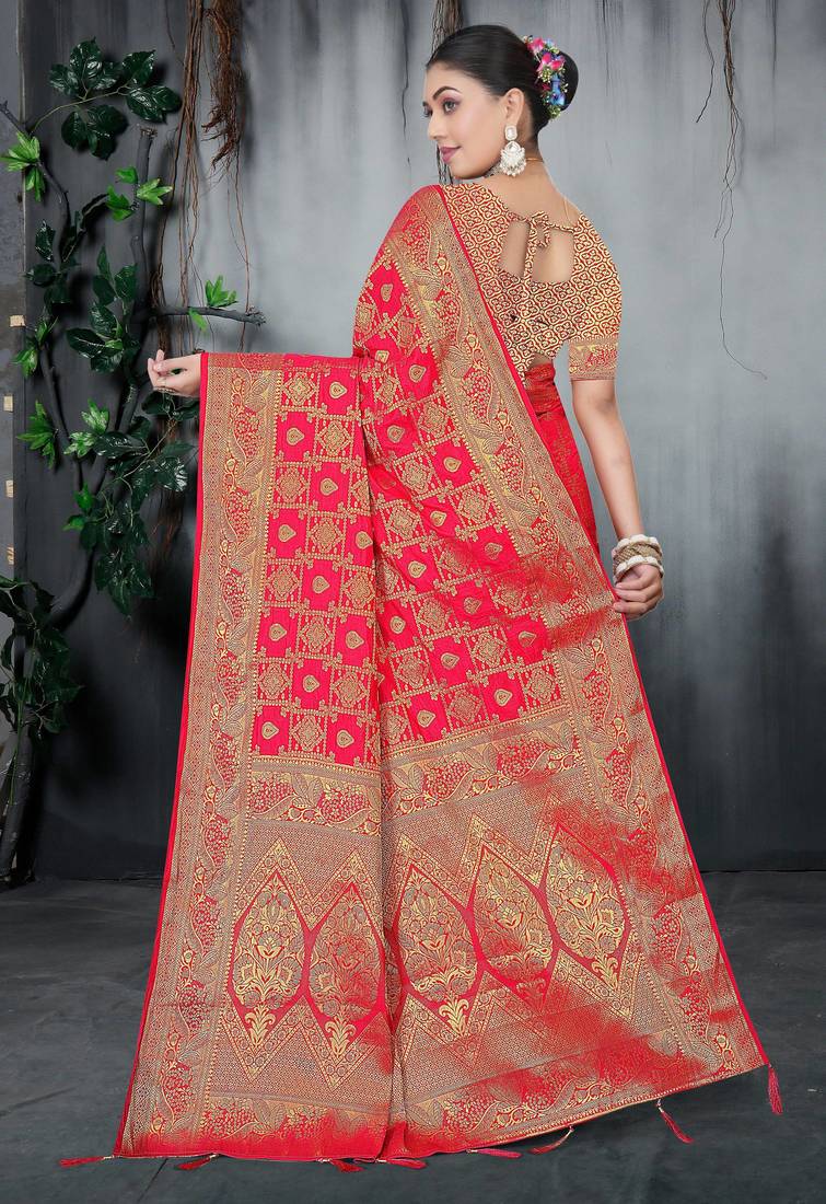 This Stunning Red Saree Is Crafted From High Quality Dola Silk Fabric, Known For Its Rich Look And Smooth Drape. The Saree Is Beautifully Adorned With Heavy Zari Woven Traditional Motifs All Over The Body, Giving It A Luxurious And Royal Appeal. It Features A Broad, Intricately Designed Zari Border And A Grand Pallu That Enhances Its Festive Charm. Ideal For Weddings, Bridal Occasions, And Special Celebrations. Comes With An Unstitched Matching Blouse Piece To Customize As Per Your Desired Fit And Design.