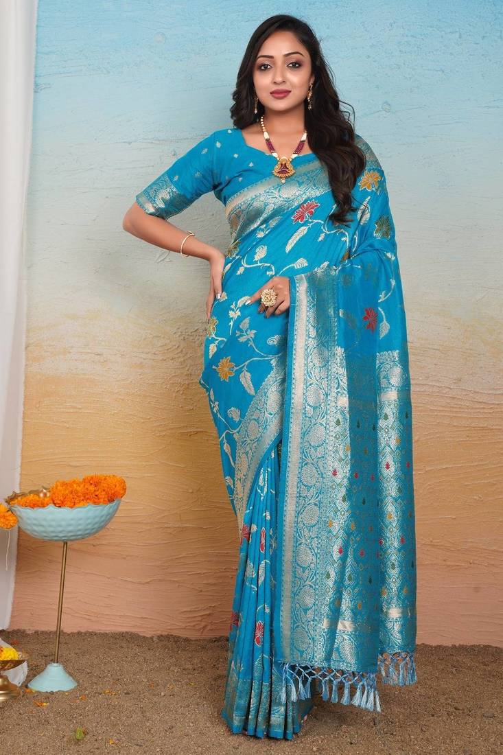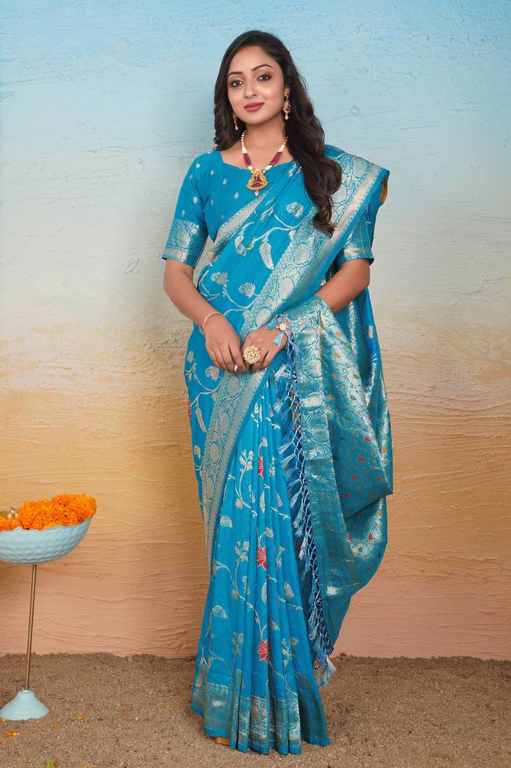 | Product Description | This Beautiful Blue Dola Silk Saree Is Crafted With Rich Zari Weaving And Multicolor Floral Thread Motifs Across The Body, Giving It A Graceful Festive Look. The Saree Comes With A Broad Traditional Border And An Intricately Designed Pallu With Tassels, Adding Royal Elegance To The Drape. Soft Texture Ensures Comfort For Long Hours, Making It Ideal For Weddings, Festivals, Pooja And Family Celebrations. Comes With Matching Unstitched Blouse Piece. |