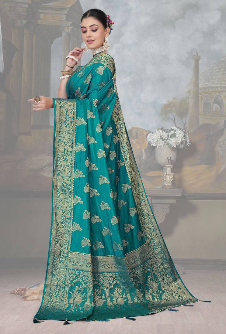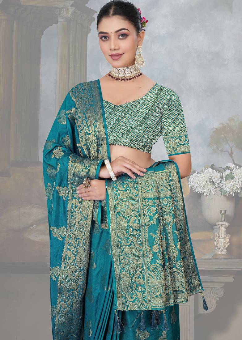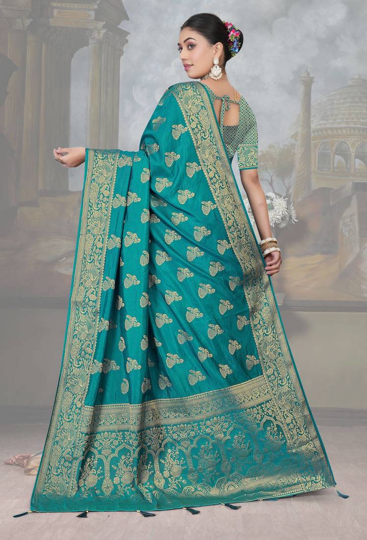 | Product Name | Teal Blue Dola Art Silk Saree With Rich Zari Woven Work & Traditional Border | Unstitched Blouse Included By Maharanga | |