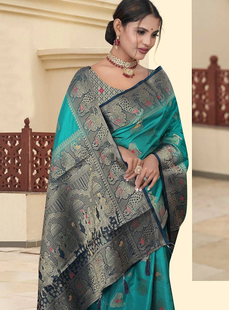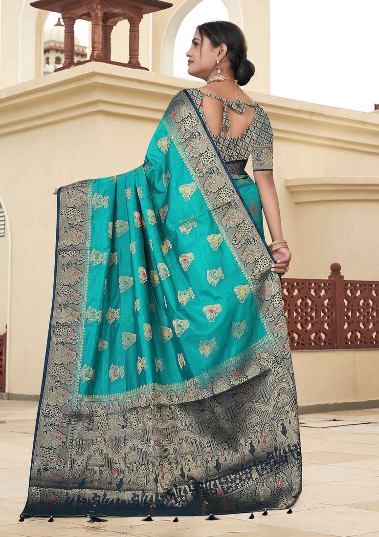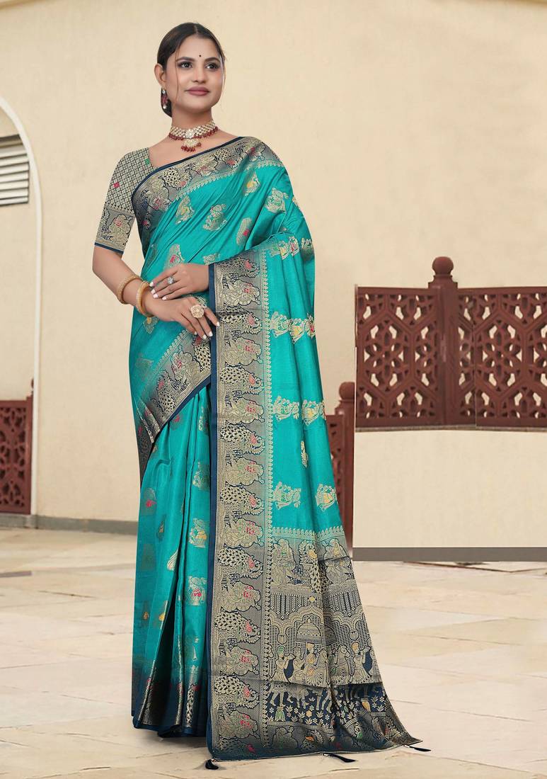 | Product Description | Bring Home Timeless Elegance With This Stunning Teal Green Dola Silk Saree Featuring Rich Gold Zari Woven Traditional Motifs All Over The Body. The Saree Is Beautifully Finished With A Broad Navy Blue And Gold Zari Border And An Intricately Designed Heritage Style Pallu, Inspired By Classic Temple And Royal Patterns. Made From Smooth And Lustrous Dola Silk Fabric, This Saree Offers Graceful Drape And Premium Comfort, Making It Ideal For Weddings, Festive Gatherings, And Cultural Functions. It Comes With A Matching Unstitched Blouse Piece, Allowing You To Customize The Fit And Style As You Prefer. |