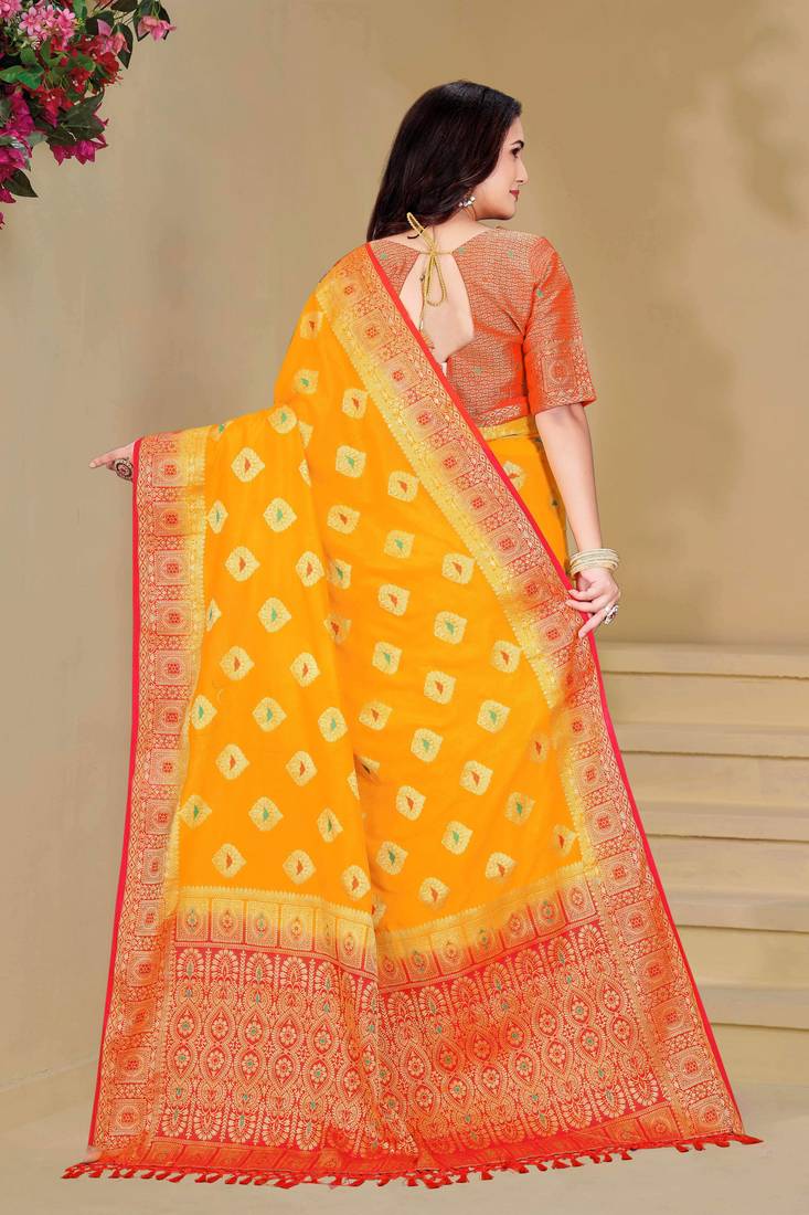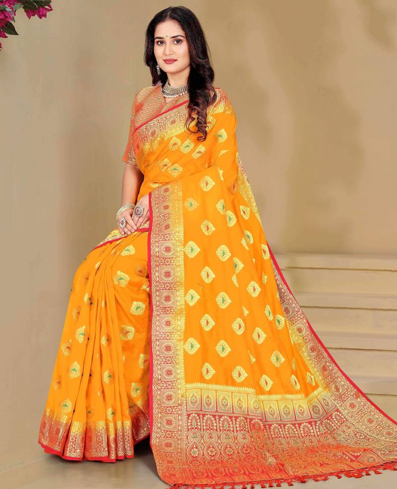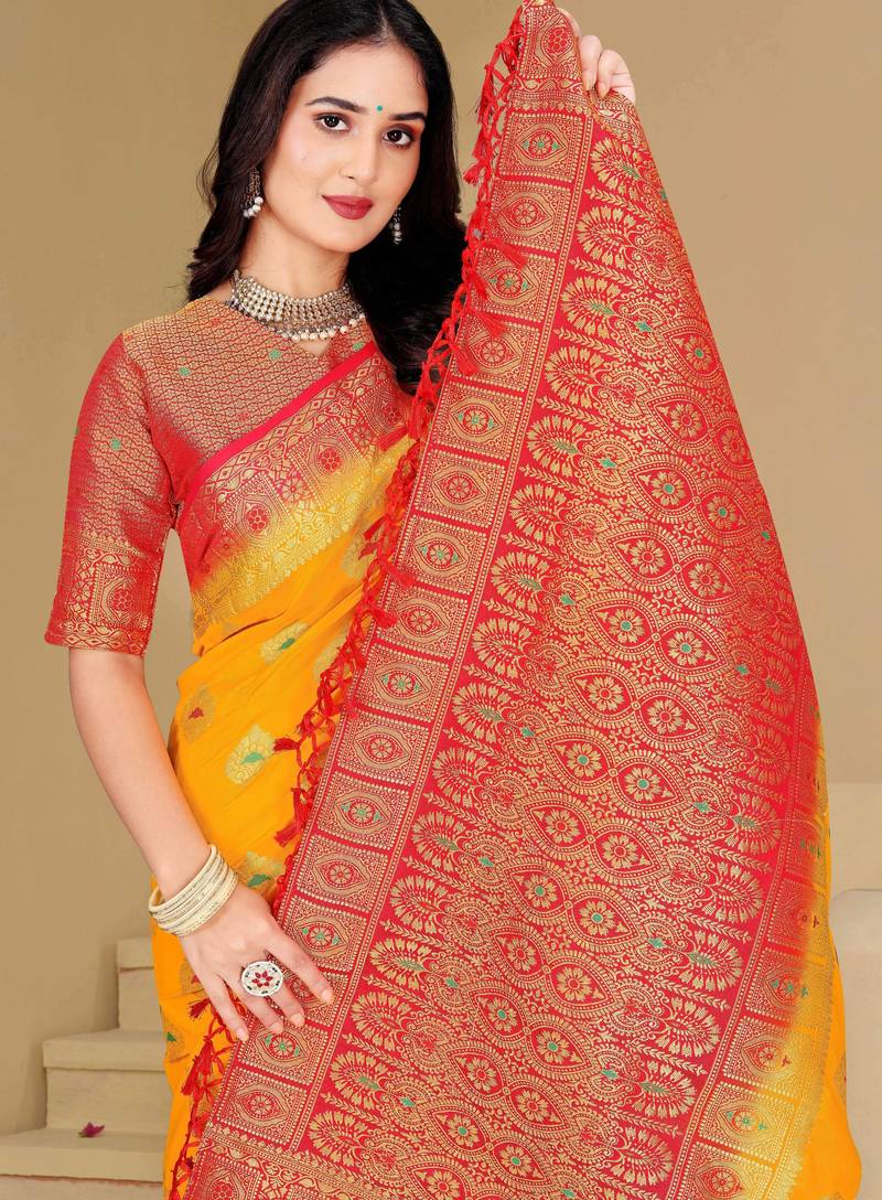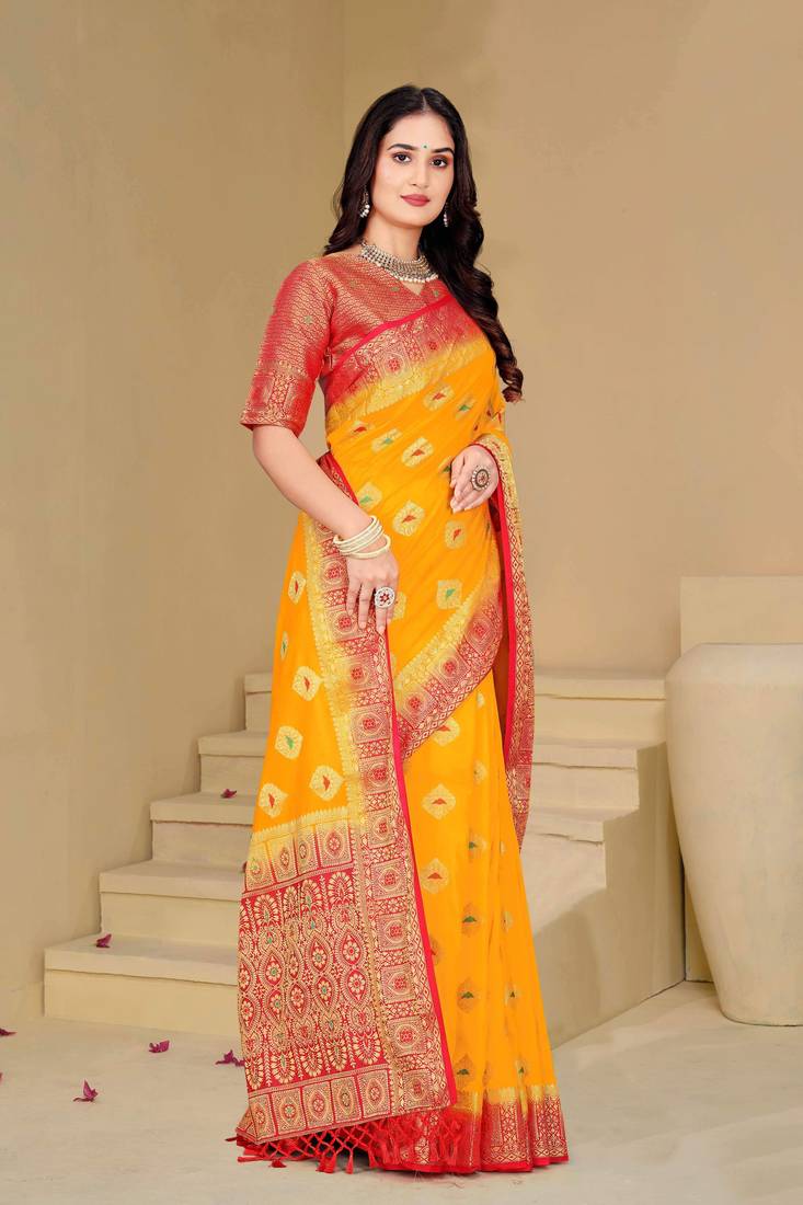 | Product Description | This Beautiful Yellow Dola Silk Saree Is Crafted With Fine Zari And Thread Woven Motifs That Give It A Rich And Traditional Appearance. The Saree Features A Striking Red Contrast Border And A Heavily Designed Pallu That Enhances Its Festive Charm. Made From Soft, Lightweight Dola Silk Fabric, It Offers Comfortable Draping With A Graceful Fall. This Saree Comes With An Unstitched Matching Blouse Piece, Making It A Perfect Choice For Weddings, Festivals, Pooja Functions, And Family Celebrations. |