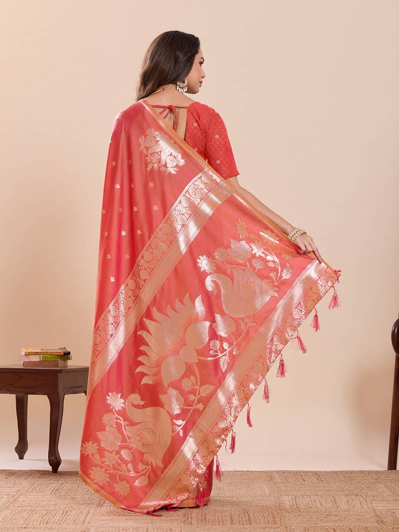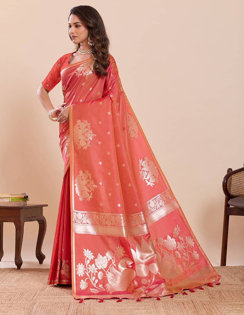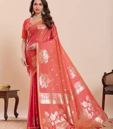 Coral peach zari woven panarasi soft art silk wedding saree with plouse