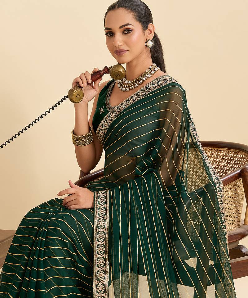 Green embroidered georgette fancy saree with striped body and heavy pallu