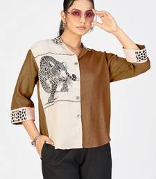 Women’s brown & cream cotton linen leopard embroidered shirt