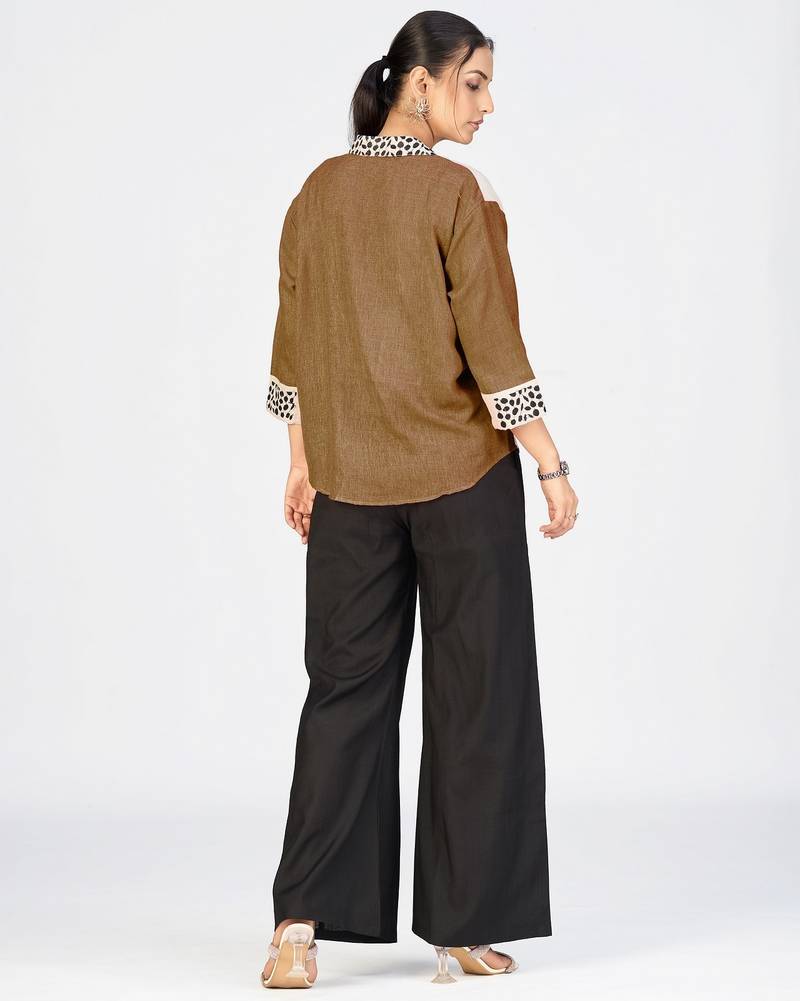 | Product Description | Make A Bold Style Statement With This Premium Brown And Cream Cotton Linen Embroidered Shirt For Women From Makhhi Wear. Designed With A Modern Color Block Pattern, This Trendy Women&Rsquo;S Casual Shirt Features A Striking Leopard Embroidery Design On The Front Panel, Adding A Fashionable And Artistic Touch To Your Wardrobe. Crafted From High Quality Cotton Linen Blend Fabric, This Women&Rsquo;S Shirt Is Lightweight, Breathable, And Comfortable For All Day Wear. The Contrast Color Block Detailing In Cream And Brown Tones, Along With Embroidered Collar And Sleeve Cuff Accents, Enhances Its Stylish Appeal. The Front Button Closure And Relaxed Fit Make It Perfect For Effortless Everyday Styling. This Embroidered Women&Rsquo;S Shirt Is Ideal For Casual Outings, Office Wear, Daily Wear, Brunch Dates, Travel, And Smart Casual Occasions. |