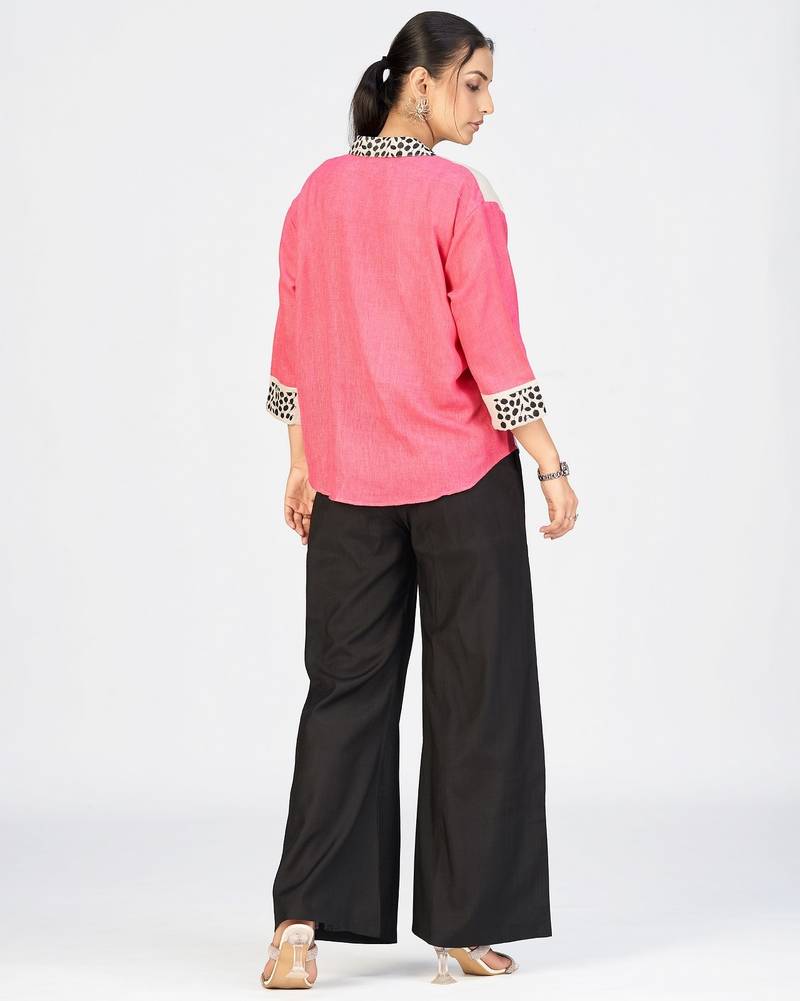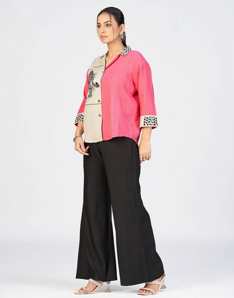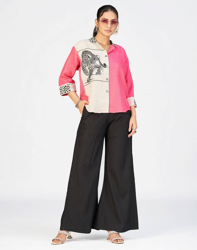 Make A Bold Style Statement With This Premium Pink And Cream Cotton Linen Embroidered Shirt For Women From Makhhi Wear. Designed With A Modern Color Block Pattern, This Trendy Women&Rsquo;S Casual Shirt Features A Striking Leopard Embroidery Design On The Front Panel, Adding A Fashionable And Artistic Touch To Your Wardrobe.