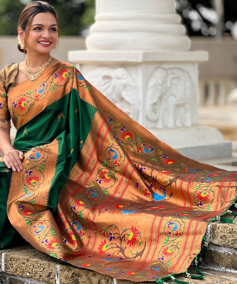 Green faux banarasi silk blend saree with paithani rich weaved pallu and blouse