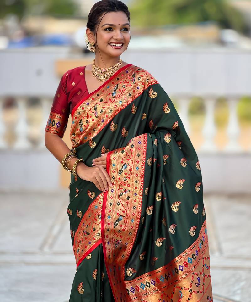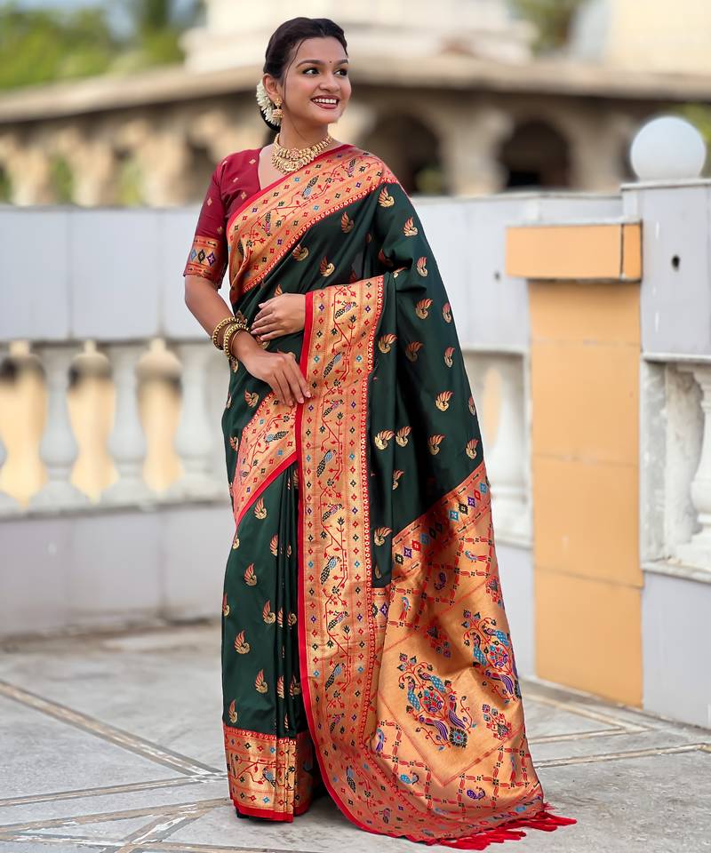 Green faux banarasi silk blend saree with paithani rich weaved pallu and blouse