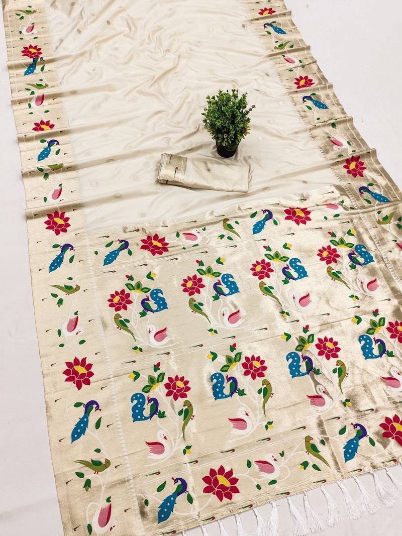 Off white faux banarasi silk saree with paithani rich weaved pallu and blouse