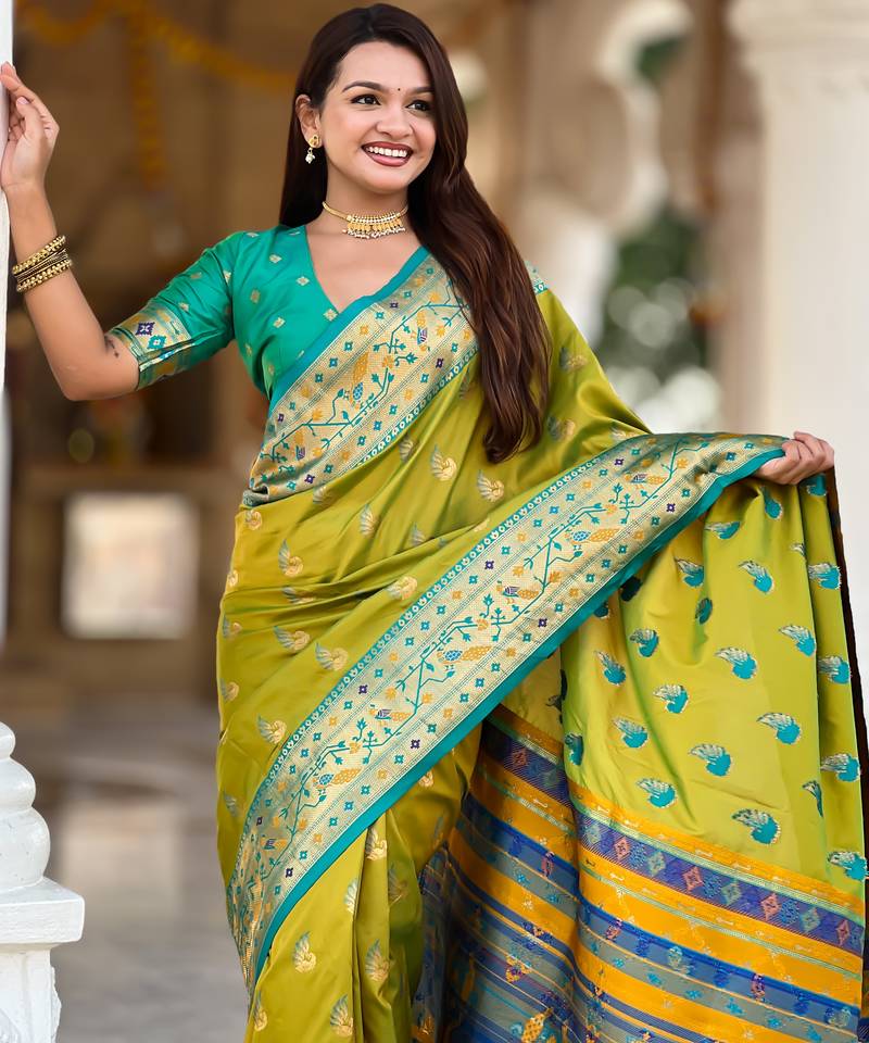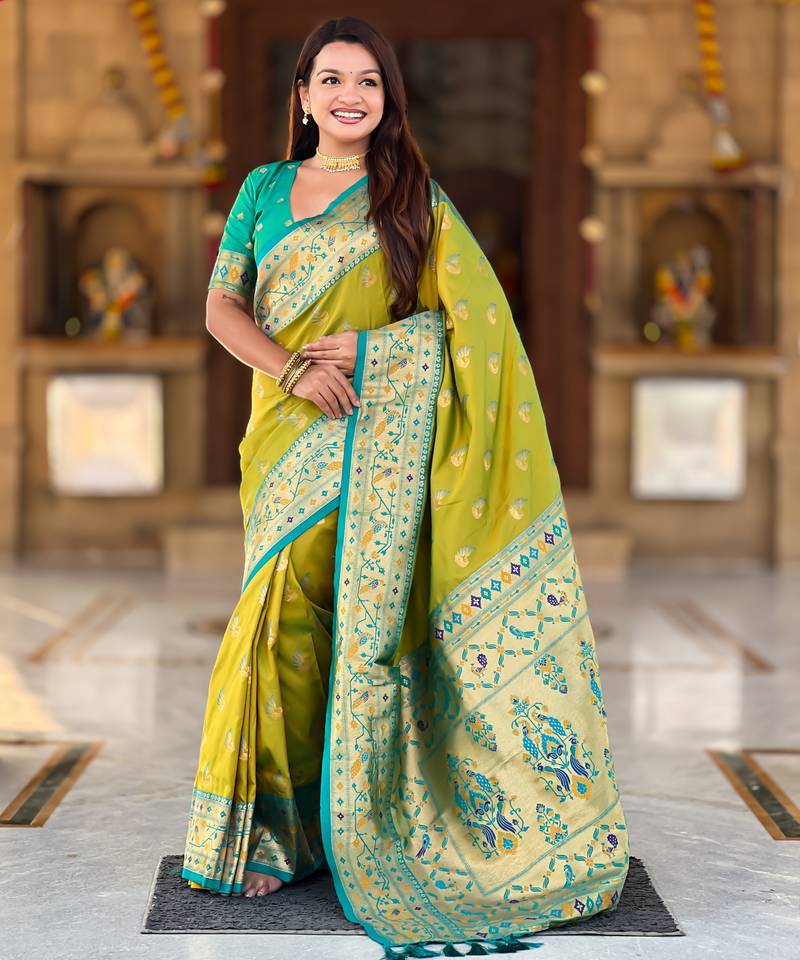 Parrot green faux banarasi silk blend saree with paithani rich weaved pallu and blouse