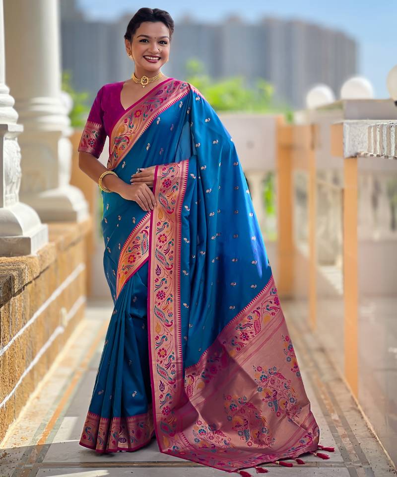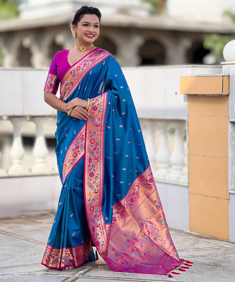 | Product Description | Soft Paithani Silk Saree With Meenakari Weawing Design And Rich Meenakari Weawing Pallu With Zari Weawing Border & Tessels Attach At Pallu End , Silk Weawing Blouse Piece |