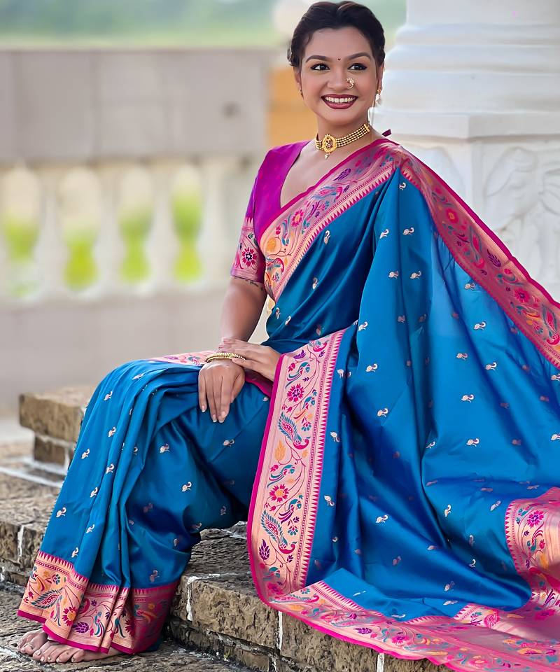 Sky blue faux banarasi silk blend saree with paithani rich weaved pallu and blouse