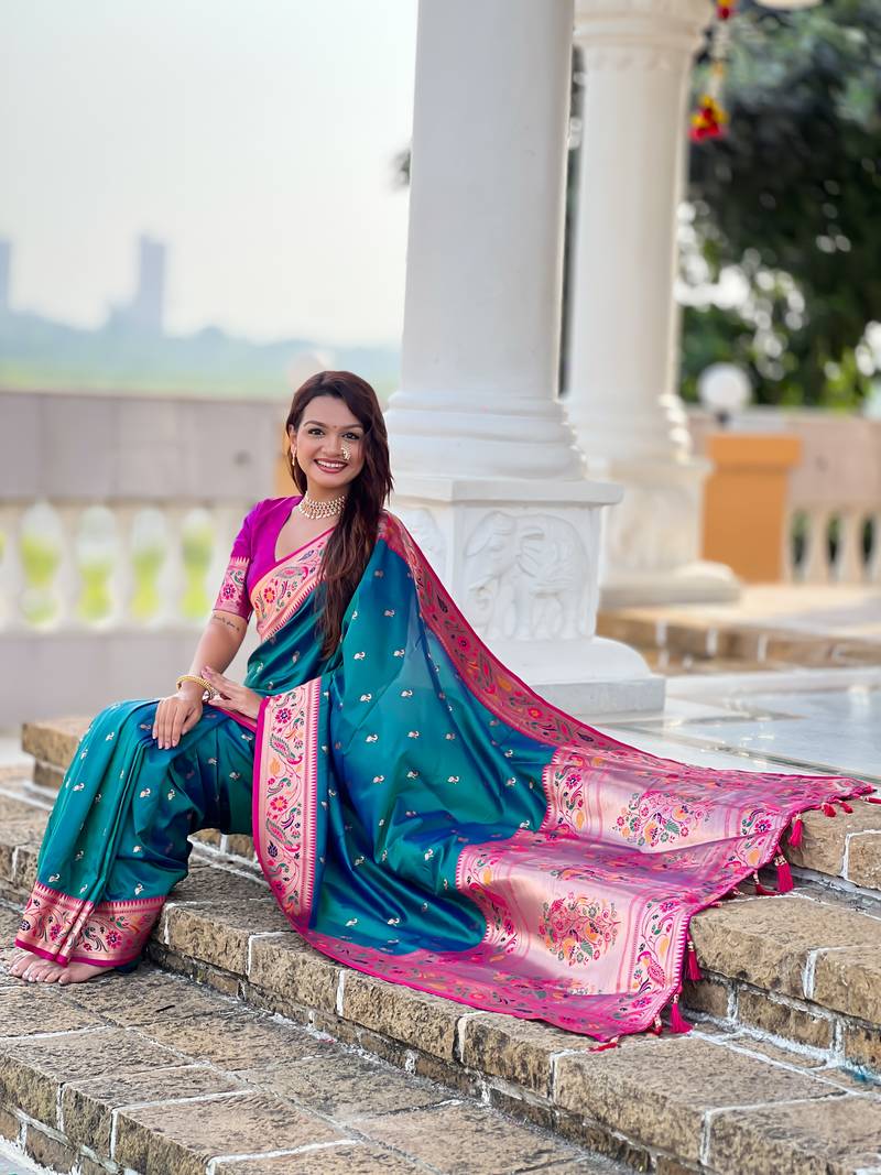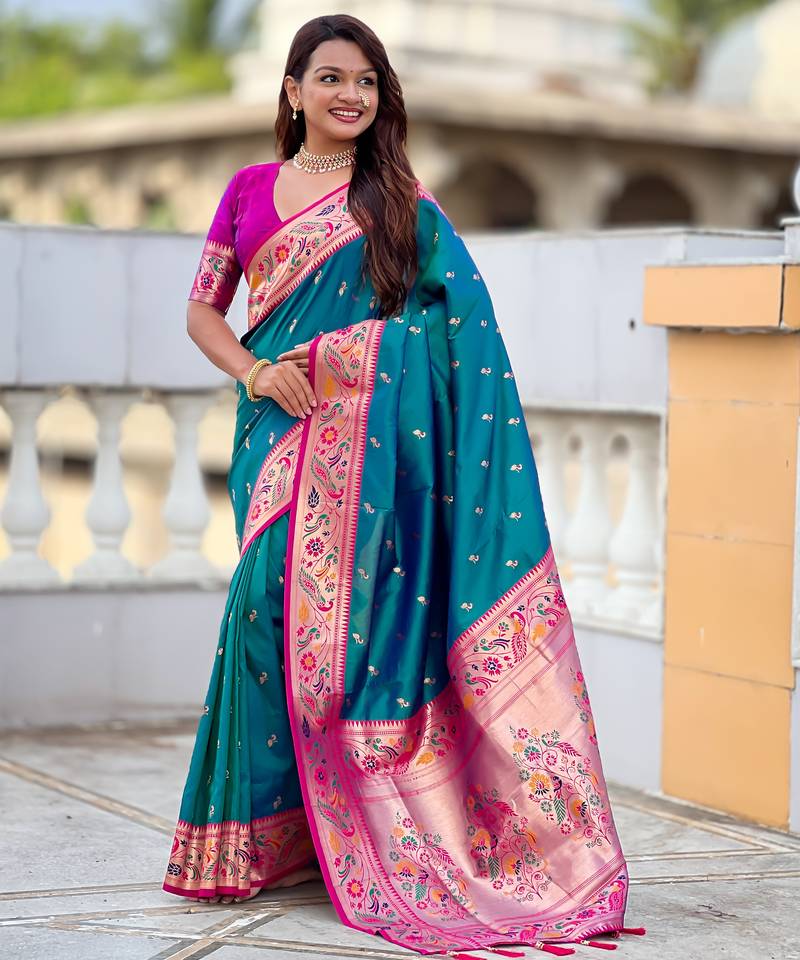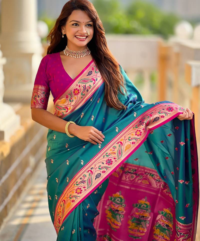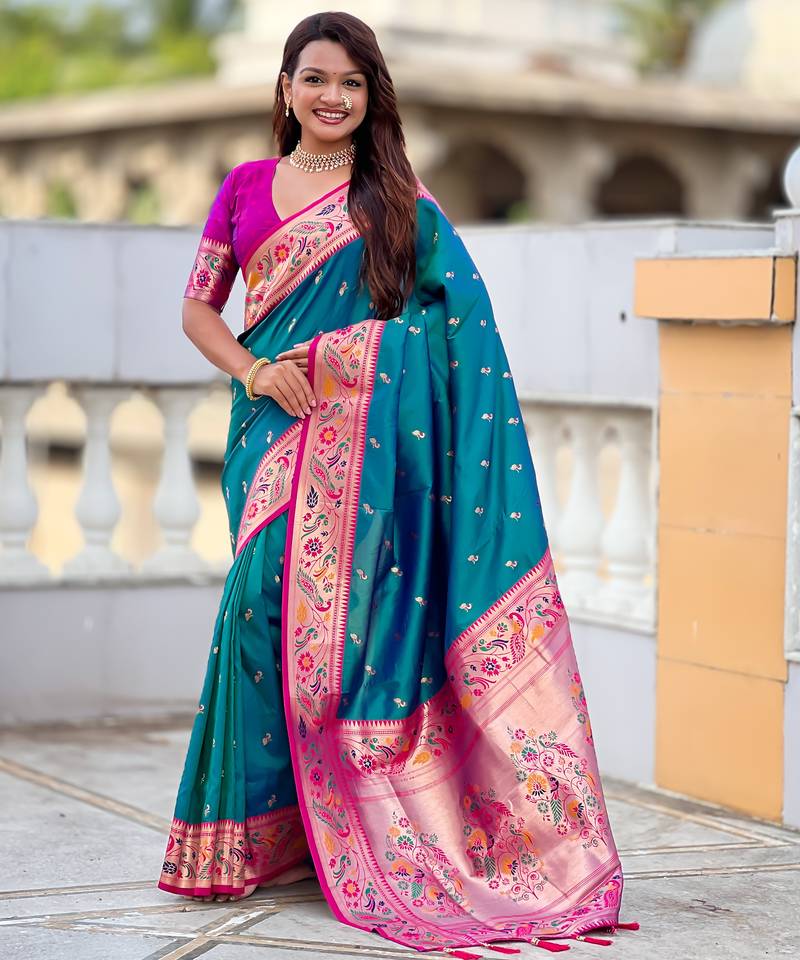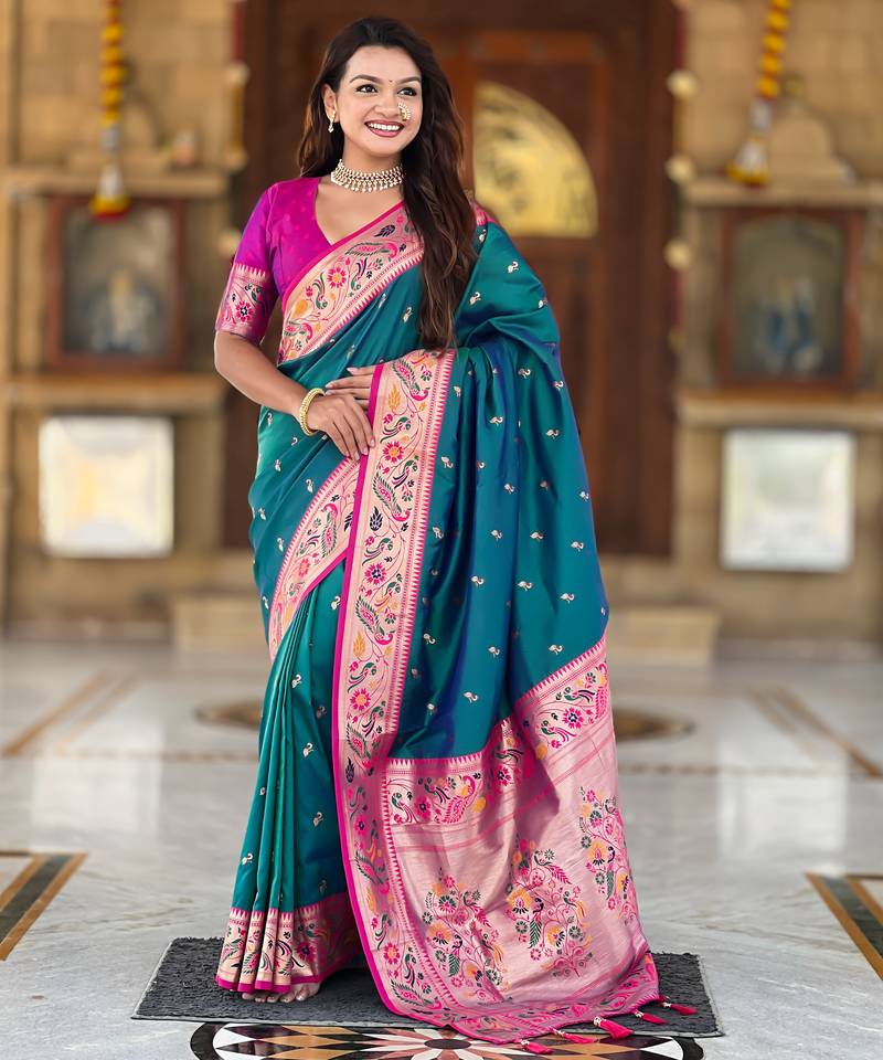 Teal blue faux banarasi silk blend saree with paithani rich weaved pallu and blouse