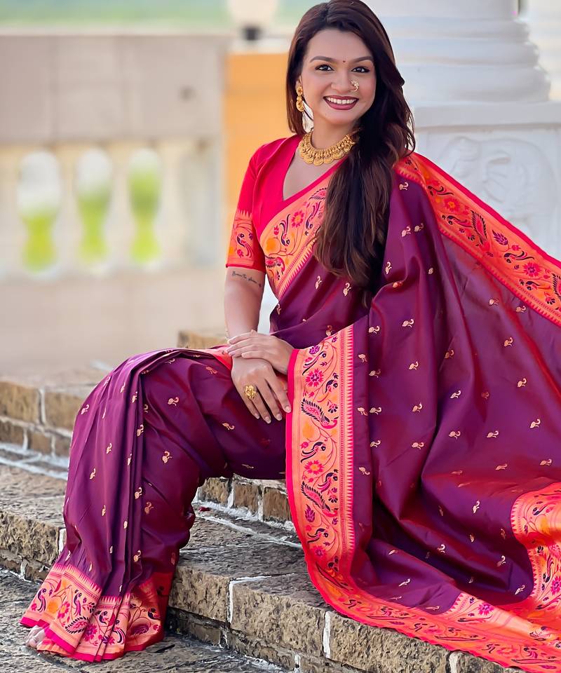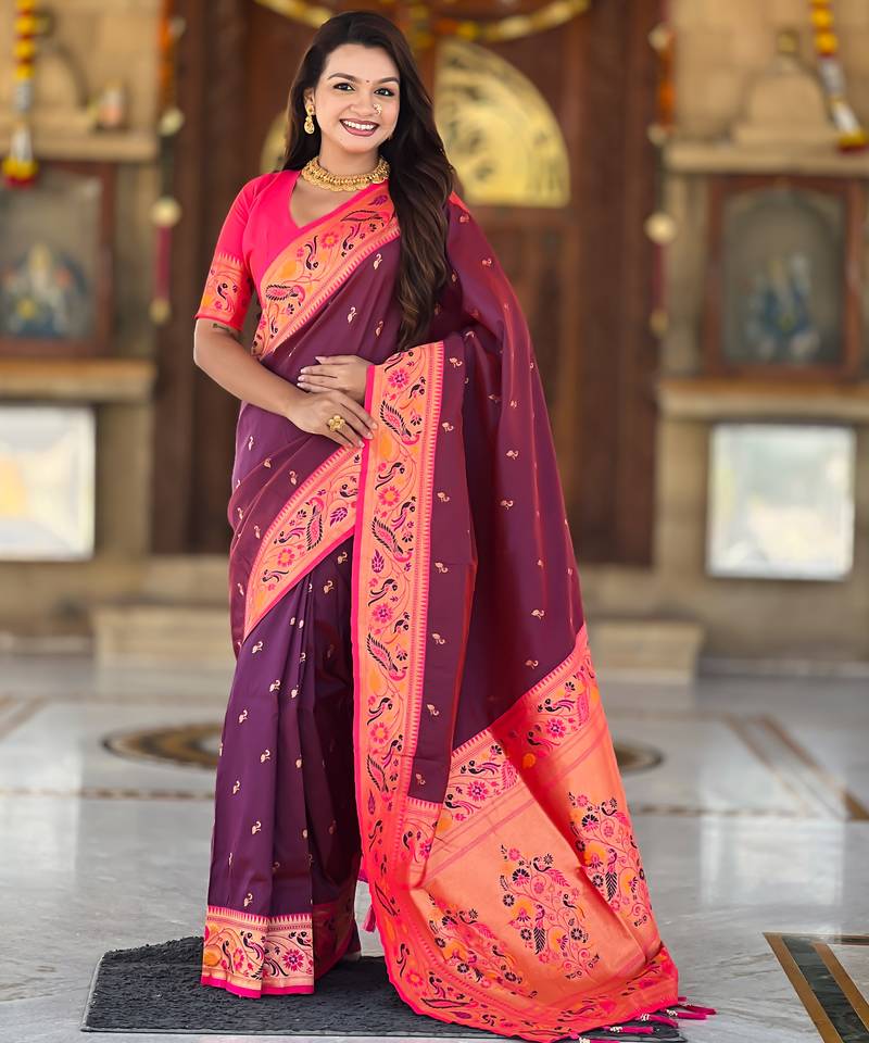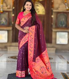 Wine faux banarasi silk blend saree with paithani rich weaved pallu and blouse