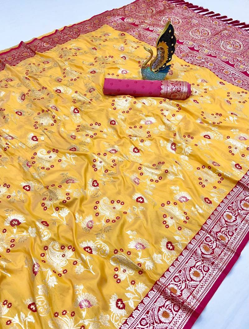 Yellow soft silk blend saree with zari weaving meenakari design