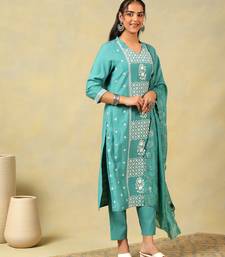 | Product Description | Exude Artisanal Charm With The Kritika Set, Featuring A Sophisticated Teal And Ivory Geometric Block Print Usp. This Elegant Suit Set Is Rendered In A Deep Teal Green Hue And Is Decorated With A Detailed White Geometric Pattern And Botanical Motifs Arranged In A Sleek Vertical Panel Design. The Kurta Is Designed With A Classic Notched V Neckline And Intricate Scalloped Embroidery Along The Dupatta Border, Adding A Touch Of Traditional Sparkle To The Ensemble. Complete With Solid Teal Trousers And A Matching Embroidered Dupatta, This Set Offers A Refined, High Impact Look For Formal Gatherings And Festivities. |