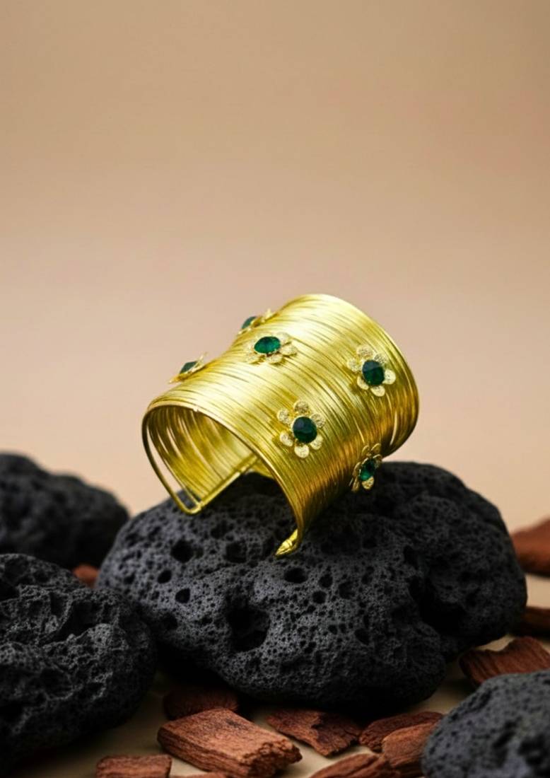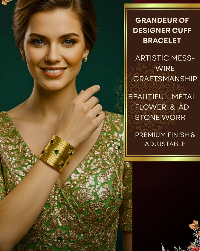| Product Description | Combo Of Two Gold Plated Mess Wire Cuff Bracelet Adorned With A Scattered Beautiful Metal Flower With Dark Green Korean Cz Shiny Stone. Its Intricate Wire Design And Bold Centerpiece Exude Elegance And Sophistication. Lightweight, Adjustable, And Perfect For Elevating Both Casual And Festive Looks. A Timeless Statement Piece For Every Jewelry Lover. |