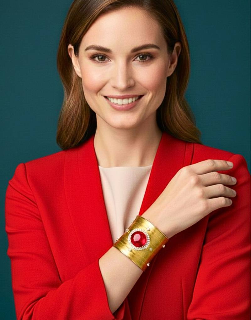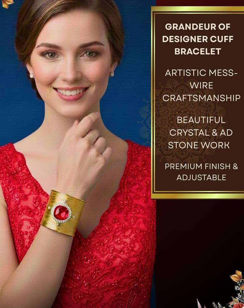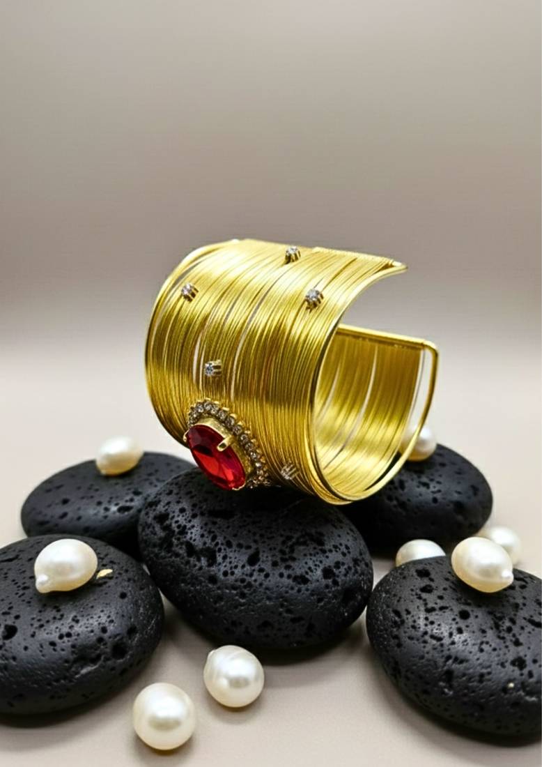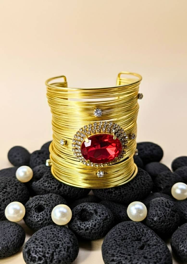 | Product Description | Combo Of Two Gold Plated Mess Wire Cuff Bracelet Adorned With A Scattered Dazzling Red Korean Cz Shiny Glass Crystal Stone. Its Intricate Wire Design And Bold Centerpiece Exude Elegance And Sophistication. Lightweight, Adjustable, And Perfect For Elevating Both Casual And Festive Looks. A Timeless Statement Piece For Every Jewelry Lover. |