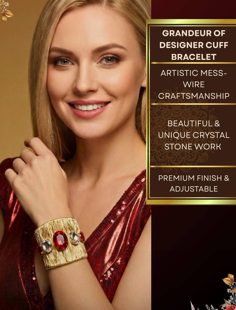 | Product Description | Combo Of Two Gold Plated Mess Wire Cuff Bracelet Adorned With A Dazzling Big Red Korean Cz Shiny Glass Crystal Stone.Its A Lightweight, Adjustable, And Perfect For Elevating Both Casual And Festive Looks. A Timeless Statement Piece For Every Jewelry Lover. |