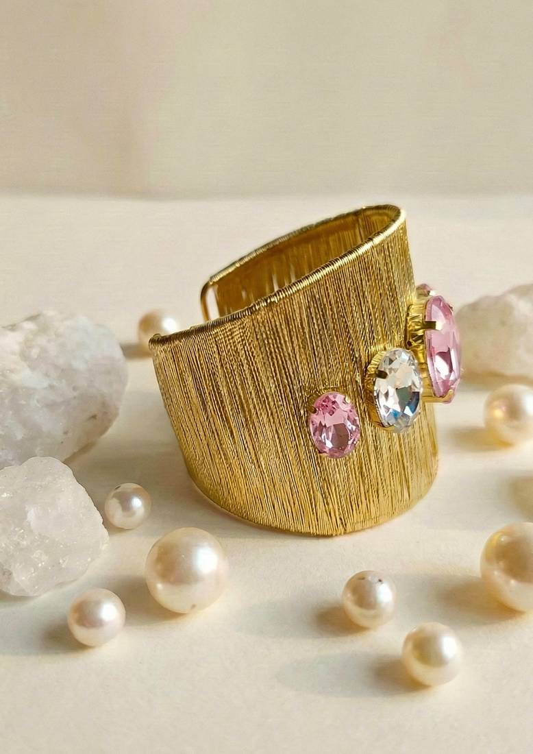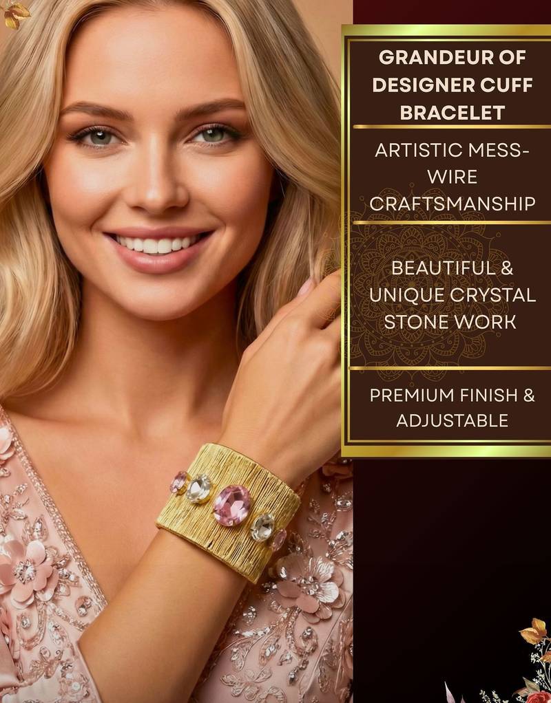 | Product Description | Gold Plated Mess Wire Cuff Bracelet Adorned With A Dazzling Big Pink Korean Cz Shiny Glass Crystal Stone.Its A Lightweight, Adjustable, And Perfect For Elevating Both Casual And Festive Looks. A Timeless Statement Piece For Every Jewelry Lover. |
