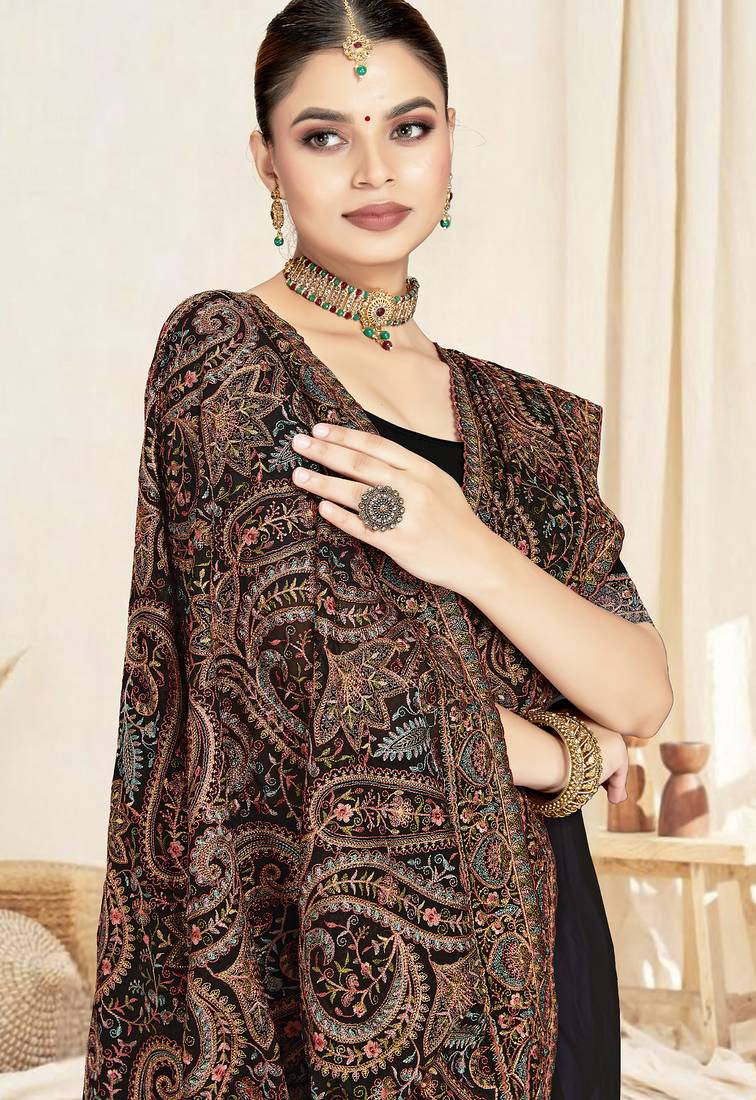 | Product Description | This Elegant Black Kashmiri Saree Is Beautifully Crafted In Lightweight Georgette Saree Fabric, Featuring Rich Kashmiri Resham Embroidery Border Work Inspired By Traditional Paisley Motifs. The Finely Detailed Embroidery Adds A Regal Touch, Making This Saree Perfect For Weddings, Festive Occasions, And Evening Celebrations. Soft, Flowy, And Graceful In Drape, This Design Stands Out Among Classic Indian Sarees. |