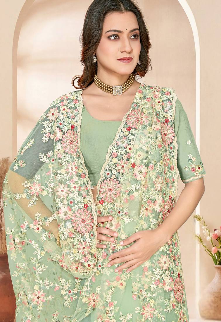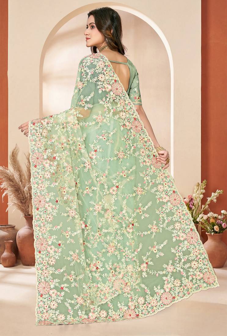 | Product Name | Green Sequin Zari Resham Embroidery Work Net Saree Sari For Women | |