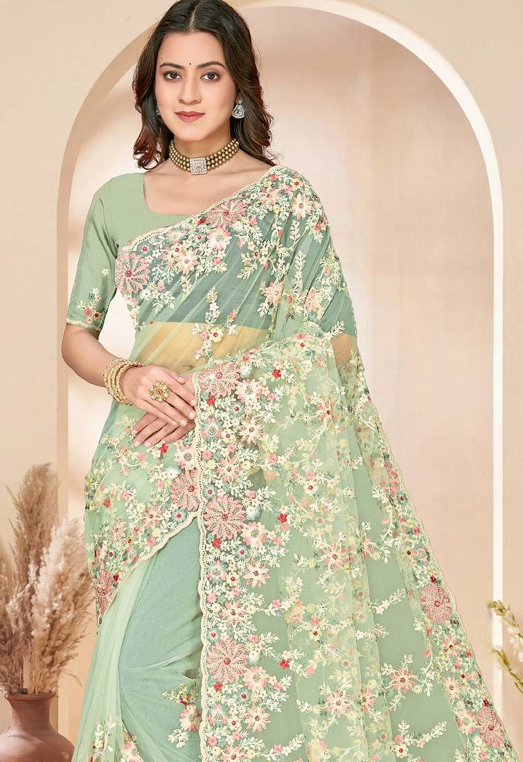 Green sequin zari resham embroidery work net saree sari for women