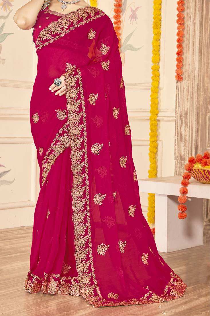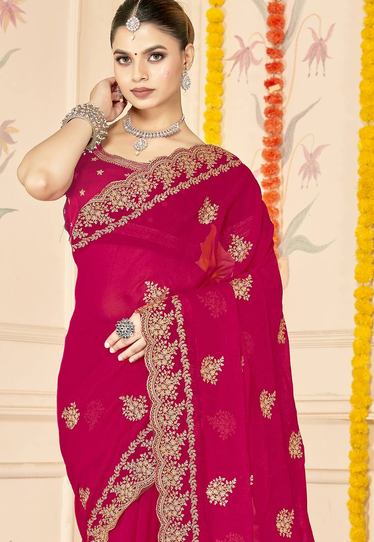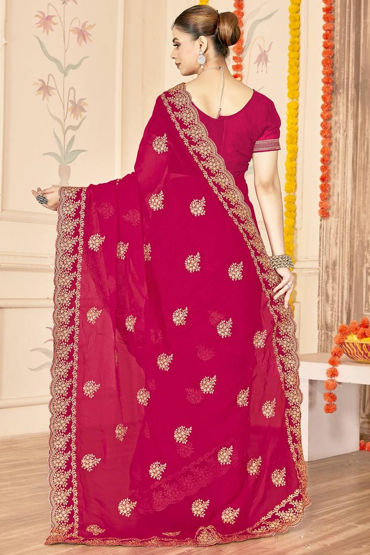 Manu Fashion Era Magenta Indian Bollywood Ethnic Style Traditional Party Wear Wedding Moss Silk Saree, Completed With Heavy Zari Embroidered, Stone Border Work. It Will Carry Magenta Unstitched Moss Silk Blouse Piece, Which Can Be Customized Up To Max 42 Indian Standard Size And Its Length 80 Cms. (Slight Variation In Color Is Possible Due To Flash Used During Photo Shoot. Blouse Shown In The Image Is Used For Photo Shoot Purpose Only, Un Stitch Blouse Piece Is Attach With Saree.)