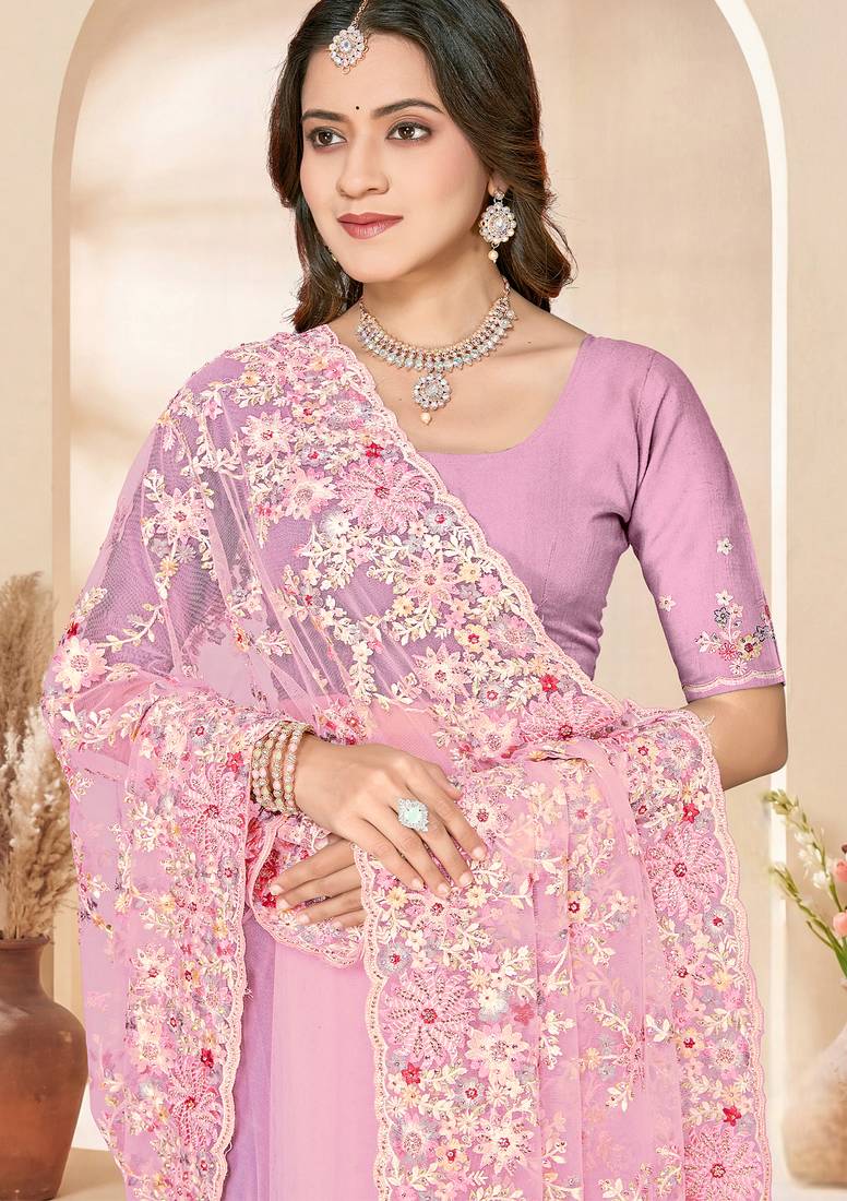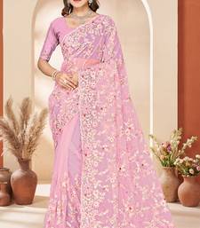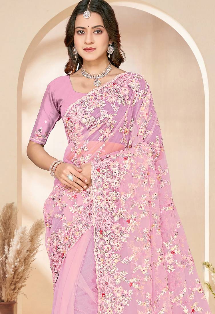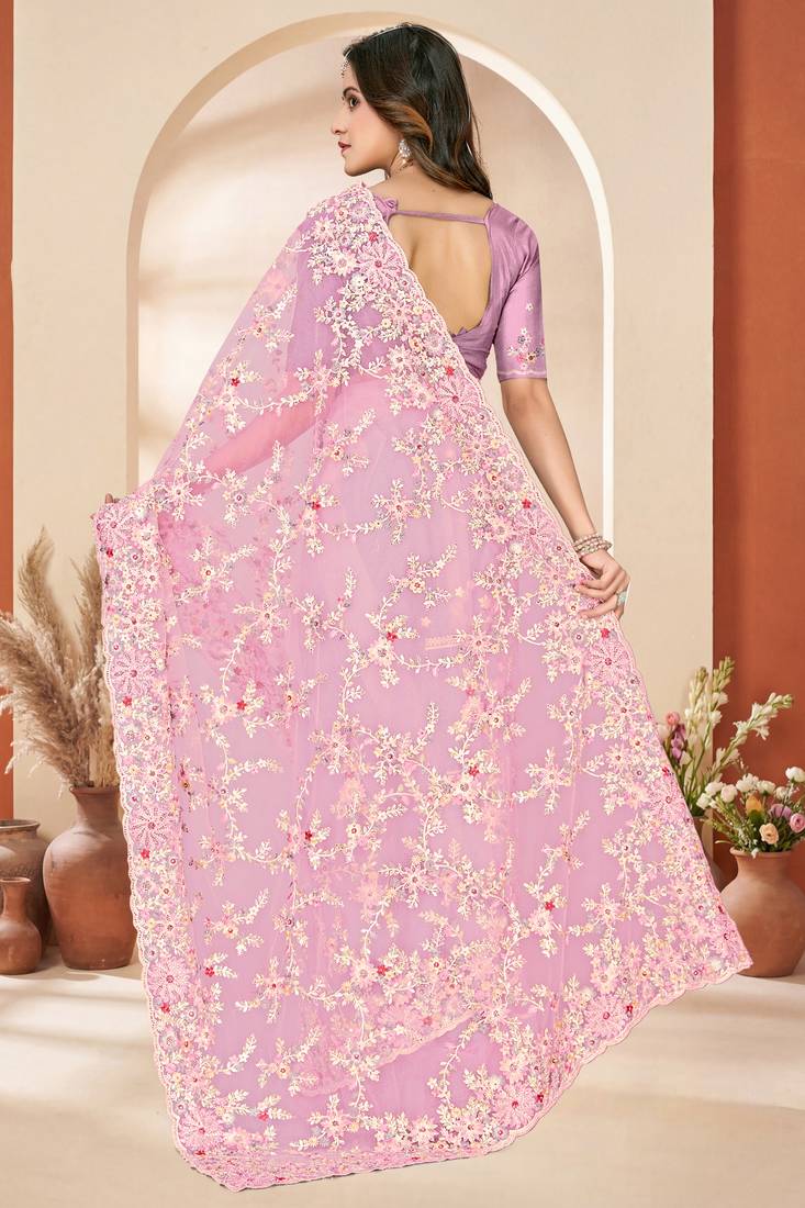 Pink sequin zari resham embroidery work net saree sari for women