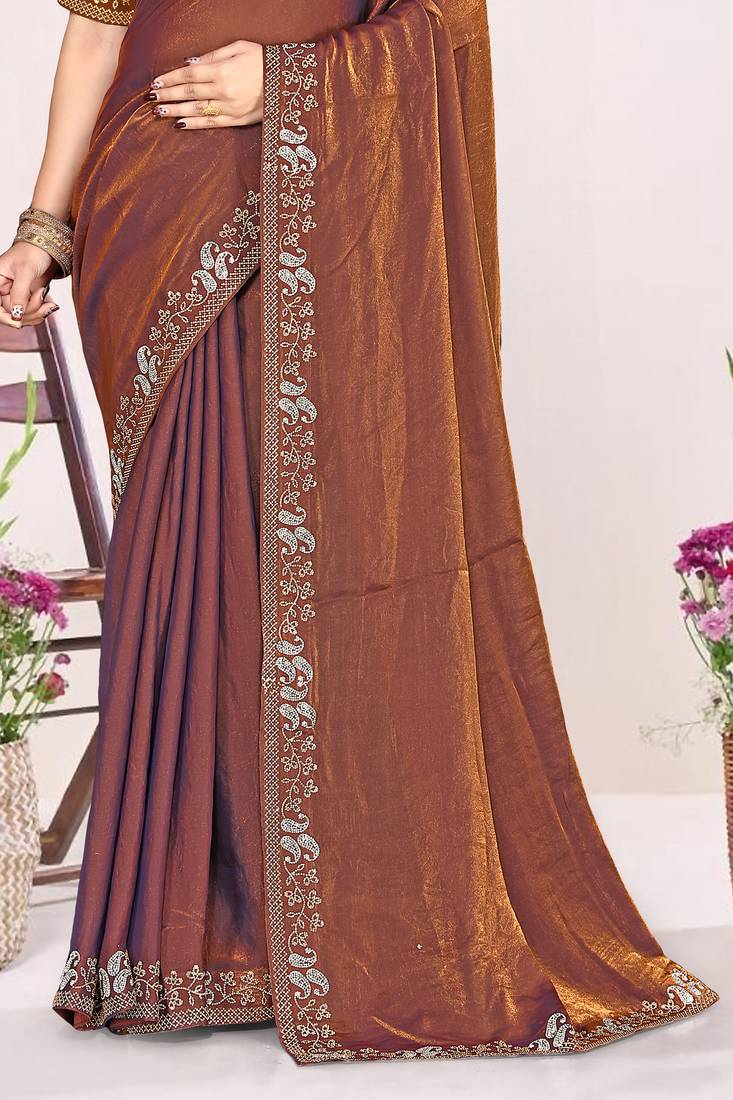 Rust sequin embellish work satin silk saree sari for women