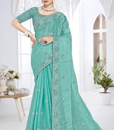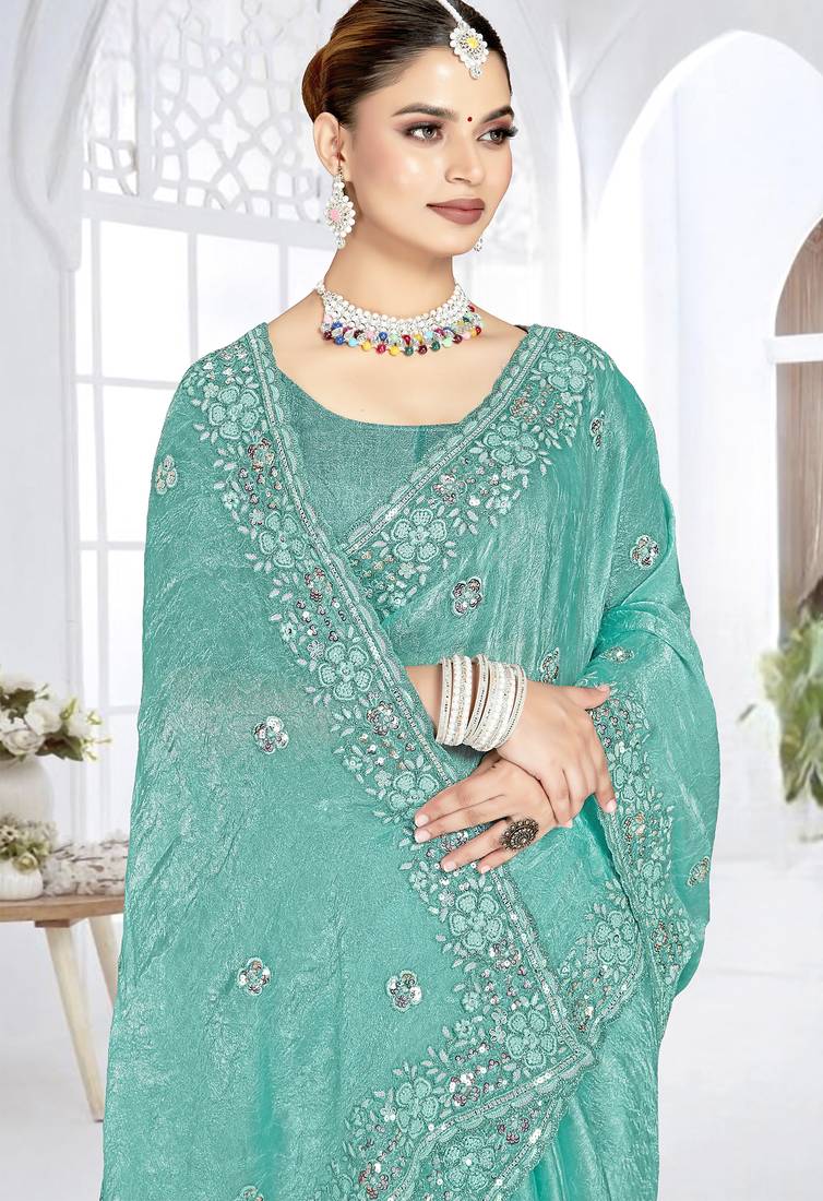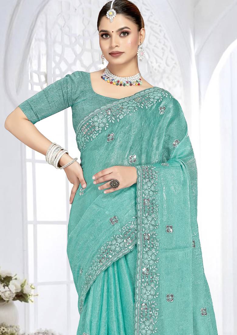sky blue sequin coding embroidered crush silk blend saree with unstitch blouse piece