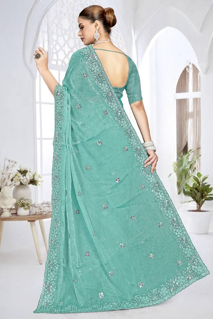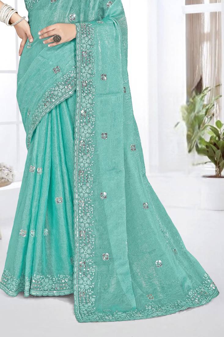Get An Elegant Looking With This Beautiful Indian Bollywood Ethnic Style Traditional Wedding Crush Silk Sky Blue Saree, Completed With Heavy Resham Sequin Coding Embroidered Border Work. It Will Carry Embroidered Border Work Unstitched Crush Silk Sky Blue Blouse Piece, Which Can Be Customized Up To Max 42 Indian Standard Size And Its Length 80 Cms. (Slight Variation In Color Is Possible Due To Flash Used During Photo Shoot. Blouse Shown In The Image Is Used For Photo Shoot Purpose Only, Un Stitch Blouse Piece Is Attach With Saree.)