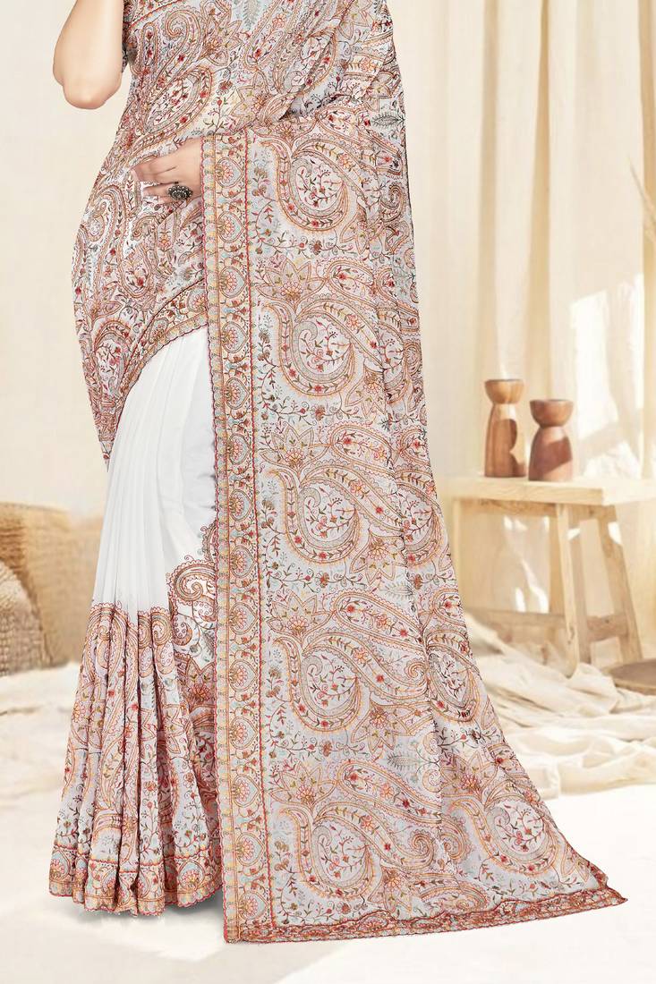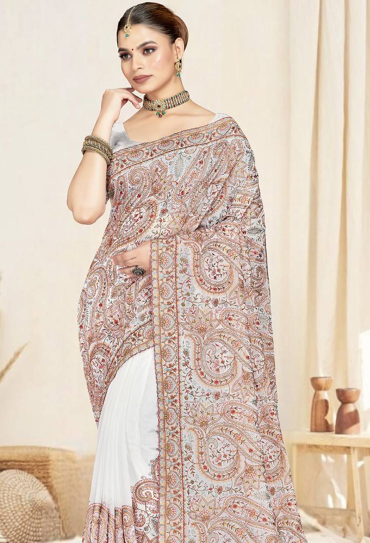 | Product Description | This Elegant White Kashmiri Saree Is Beautifully Crafted In Lightweight Georgette Saree Fabric, Featuring Rich Kashmiri Resham Embroidery Border Work Inspired By Traditional Paisley Motifs. The Finely Detailed Embroidery Adds A Regal Touch, Making This Saree Perfect For Weddings, Festive Occasions, And Evening Celebrations. Soft, Flowy, And Graceful In Drape, This Design Stands Out Among Classic Indian Sarees. |