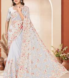 White sequin zari resham embroidery work net saree sari for women