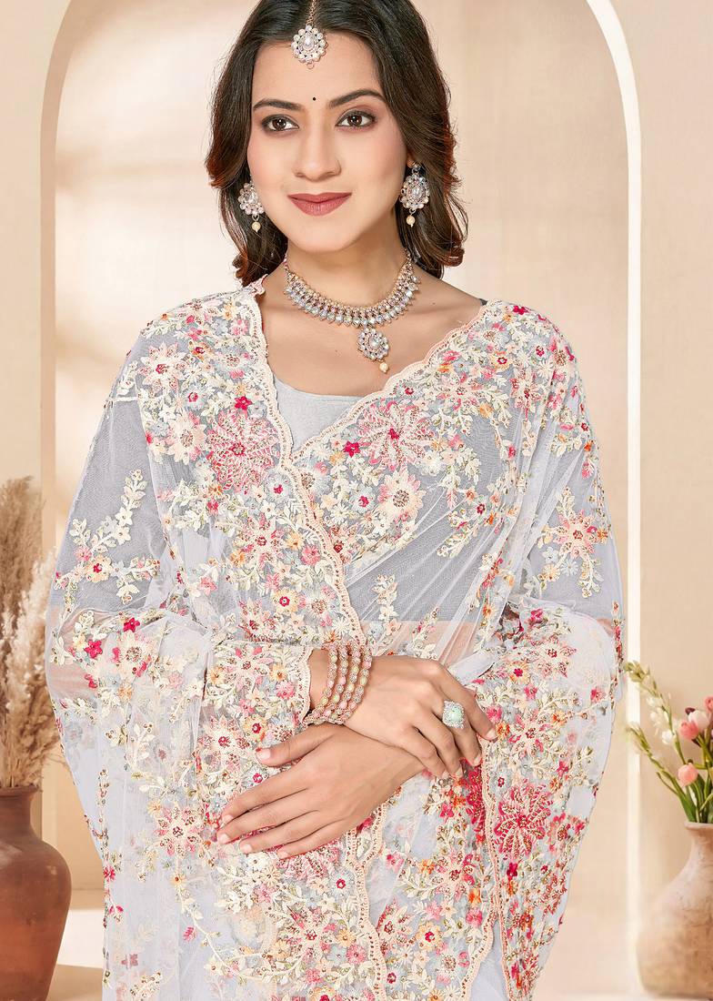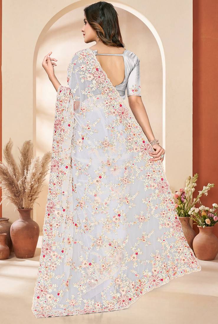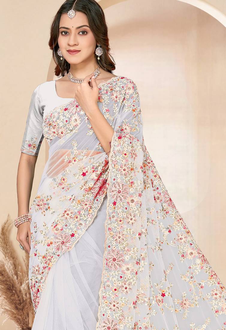 | Product Name | White Sequin Zari Resham Embroidery Work Net Saree Sari For Women | |