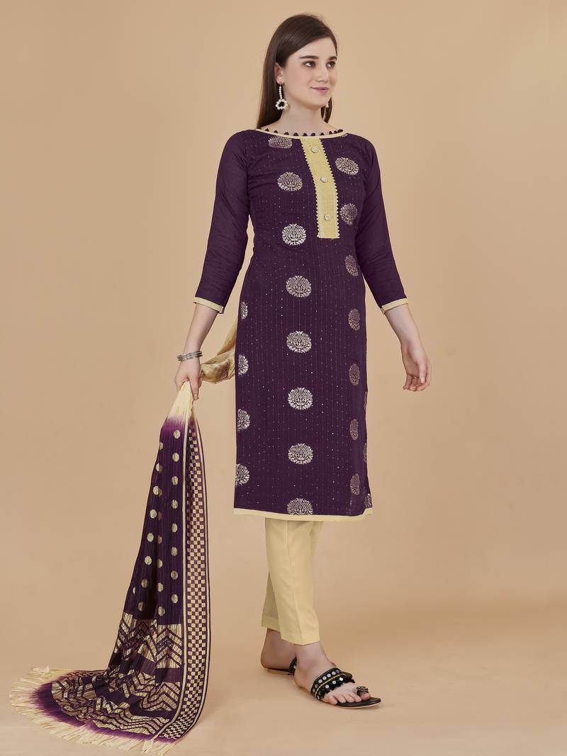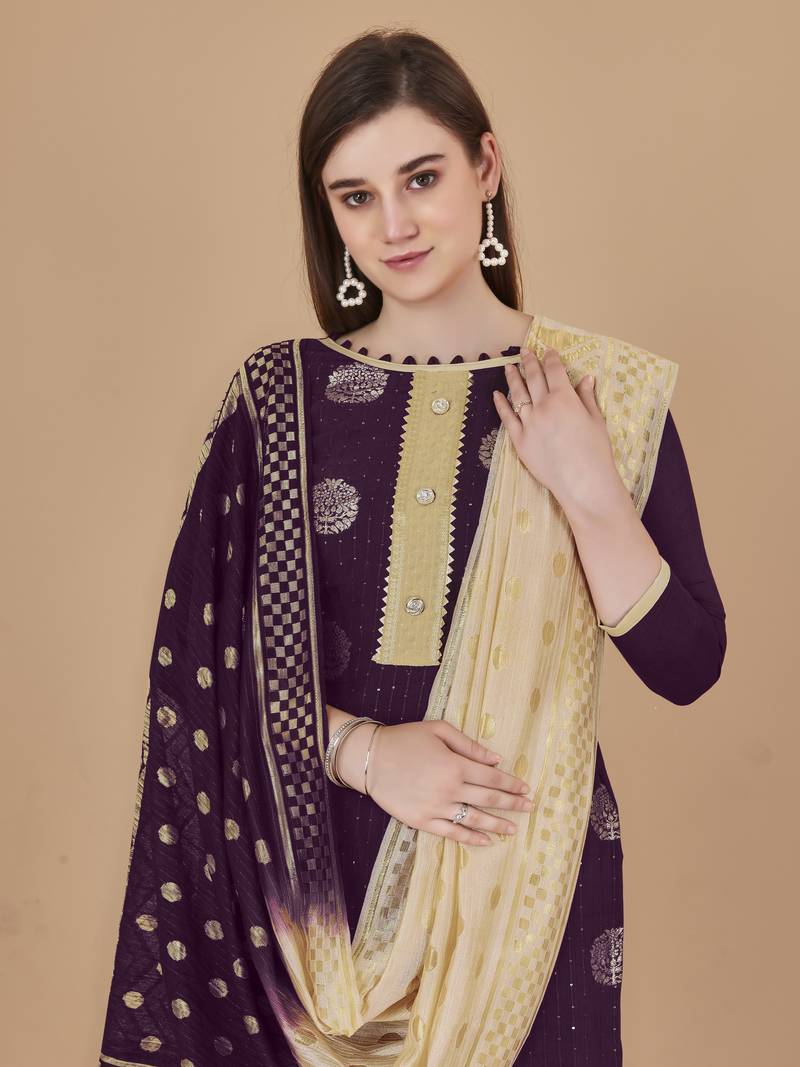 Women's Magenta Unstitched Designer Weaving And Sequence Work With Fancy Dupatta Cotton Jacquard Dress Material Having Beige Color Bottom Of Cotton Fabric And Multi Color Dupatta Of Rasal Net Material With Amazing Magenta Colour In Cotton Jacquard Rasal Net Fabric With Work Of Designer Weaving And Sequence Work With Fancy Dupatta|| Images Are For The Referance Purpose Only, Color Of The Actual Product May Little Vary From The Image Due To Screen Resolution