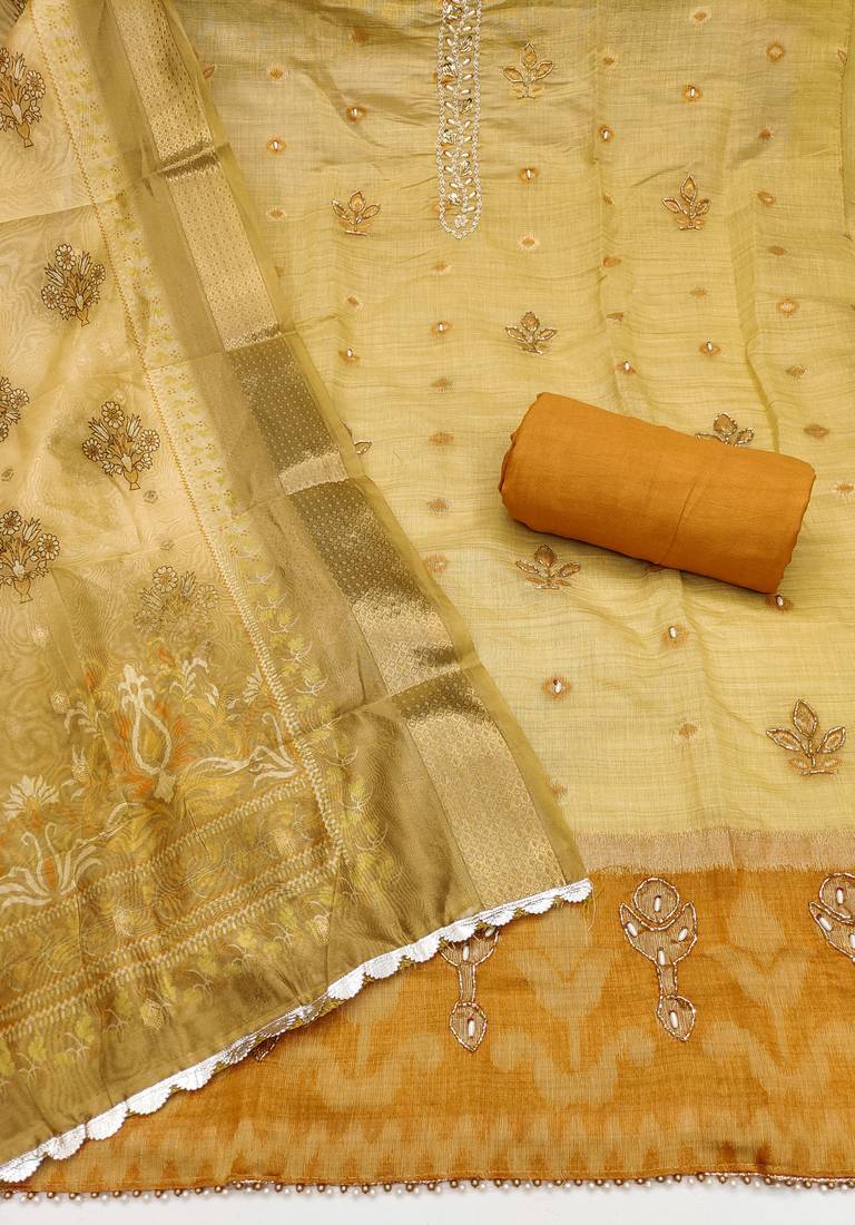 | Product Description | Elevate Your Ethnic Wardrobe With This Beige Unstitched Salwar Kameez Crafted From Premium Jamdhani Banarasi Fabric. The Top Is Adorned With Intricate Heavy Weaving Handwork And A Designer Fancy Border, Creating A Luxurious And Elegant Appeal. It Comes With A Comfortable Orange Unstitched Rayon Bottom, Allowing You To Customize The Outfit According To Your Preferred Fit And Style. Completing The Set Is A Matching Soft Beige Organza Dupatta Featuring Designer Woven Patterns, Adding Charm And Sophistication. Perfect For Weddings, Festivals, And Traditional Occasions, This Unstitched Salwar Kameez Blends Timeless Craftsmanship With Contemporary Elegance. |